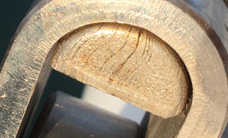 Wie man sieht fehlen 5 von 8 Nieten. Die Nieten sind auch aus minderwertigem Alu! Und das Lager hatte keine Führung mehr.