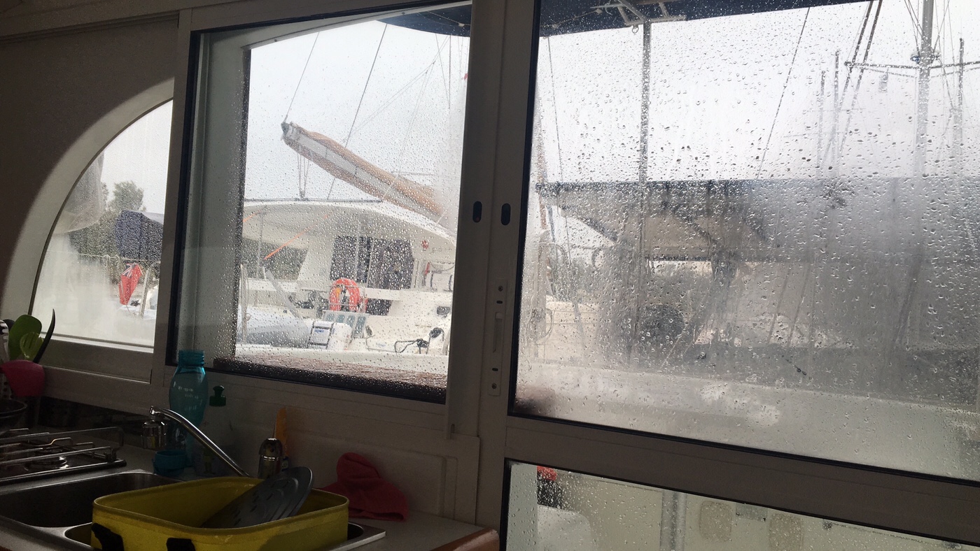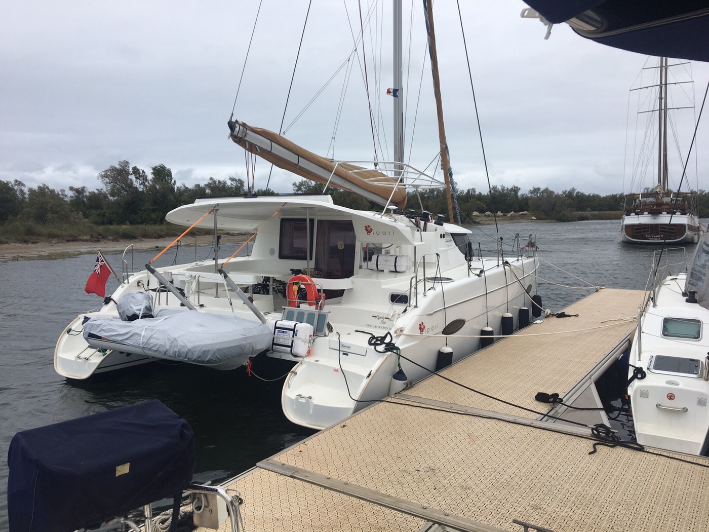 Aber langweilig wird es nicht. Gerade hat ein älteres Ehepaar seinen Katamaran besser festmachen wollen. Leider haben sie die Idee gehabt, die bestehenden Leinen zu lösen und dann danach die neuen Verbindungen zu setzen. Der Kat trieb bei dem Wind sofort quer ab. Keine Nussschale: