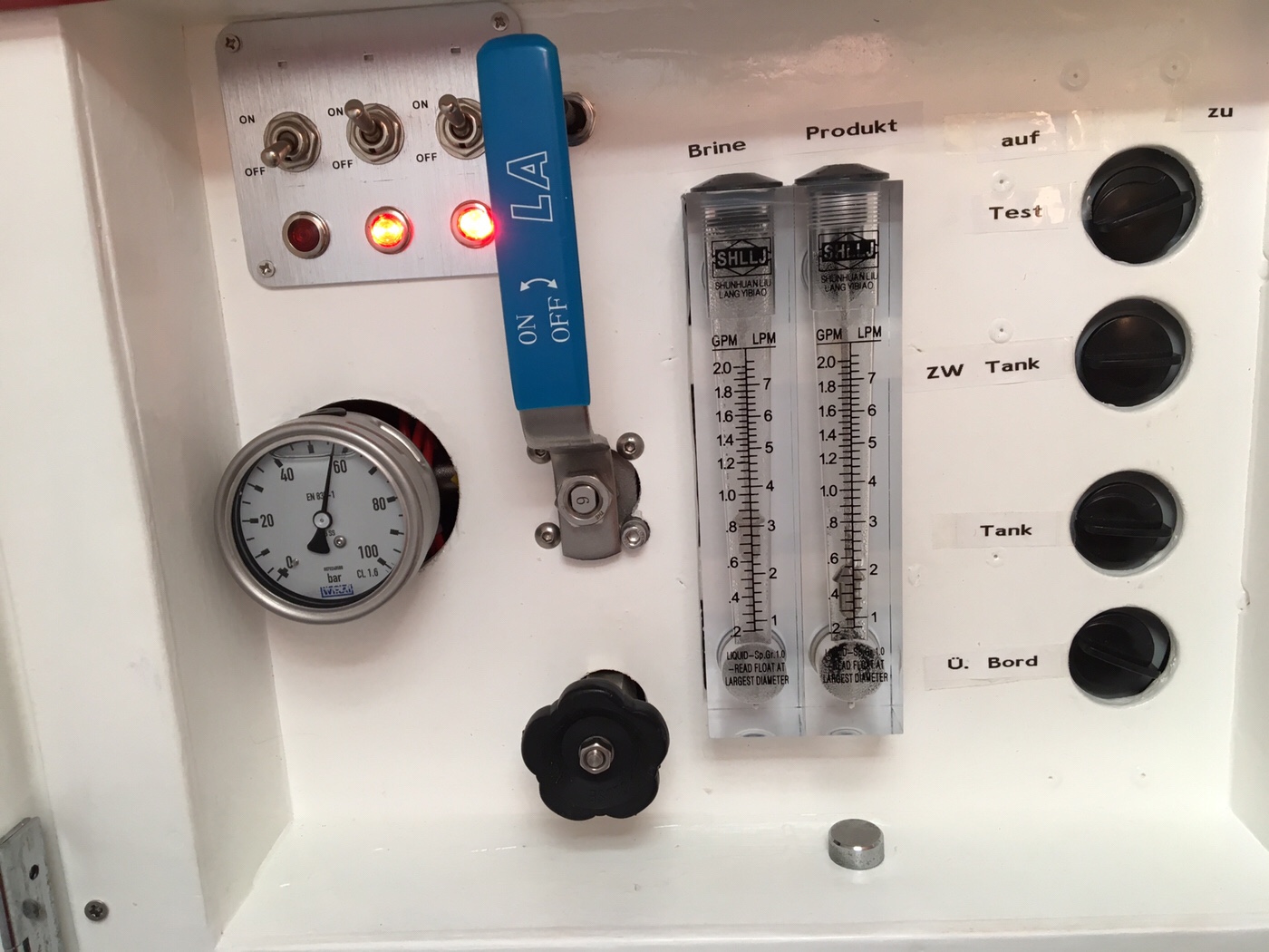Heute war Premiere. Der Wassermacher ist fertig und wollte getestet werden. Gestern haben wir die Filter in die Druckrohre eingesetzt und noch einmal alle Schlauchverbindungen überprüft.