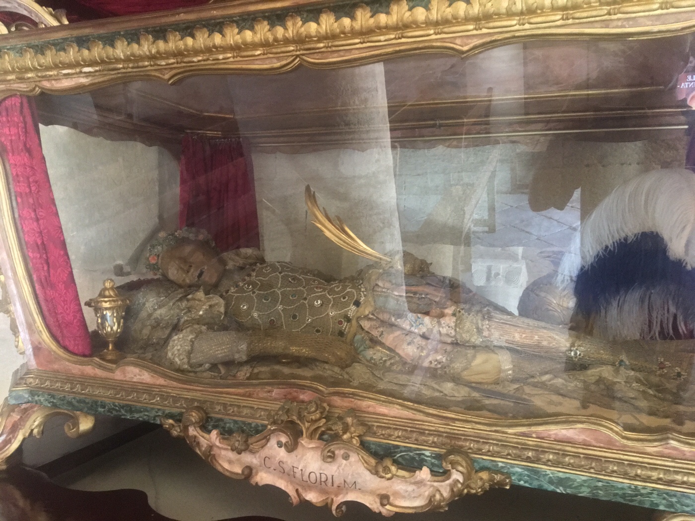 Gestern haben wir in Kultur gemacht. Die Kathedrale von Saint Florent war angesagt. Hier wird ein römischer Soldat aus Jerusalem als Reliquie in einem Glassarkophag aufbewahrt und zu bestimmten Anlässen durch die Straßen getragen. Der Bursche hat schon etwas Spuren der Zeit davongetragen: