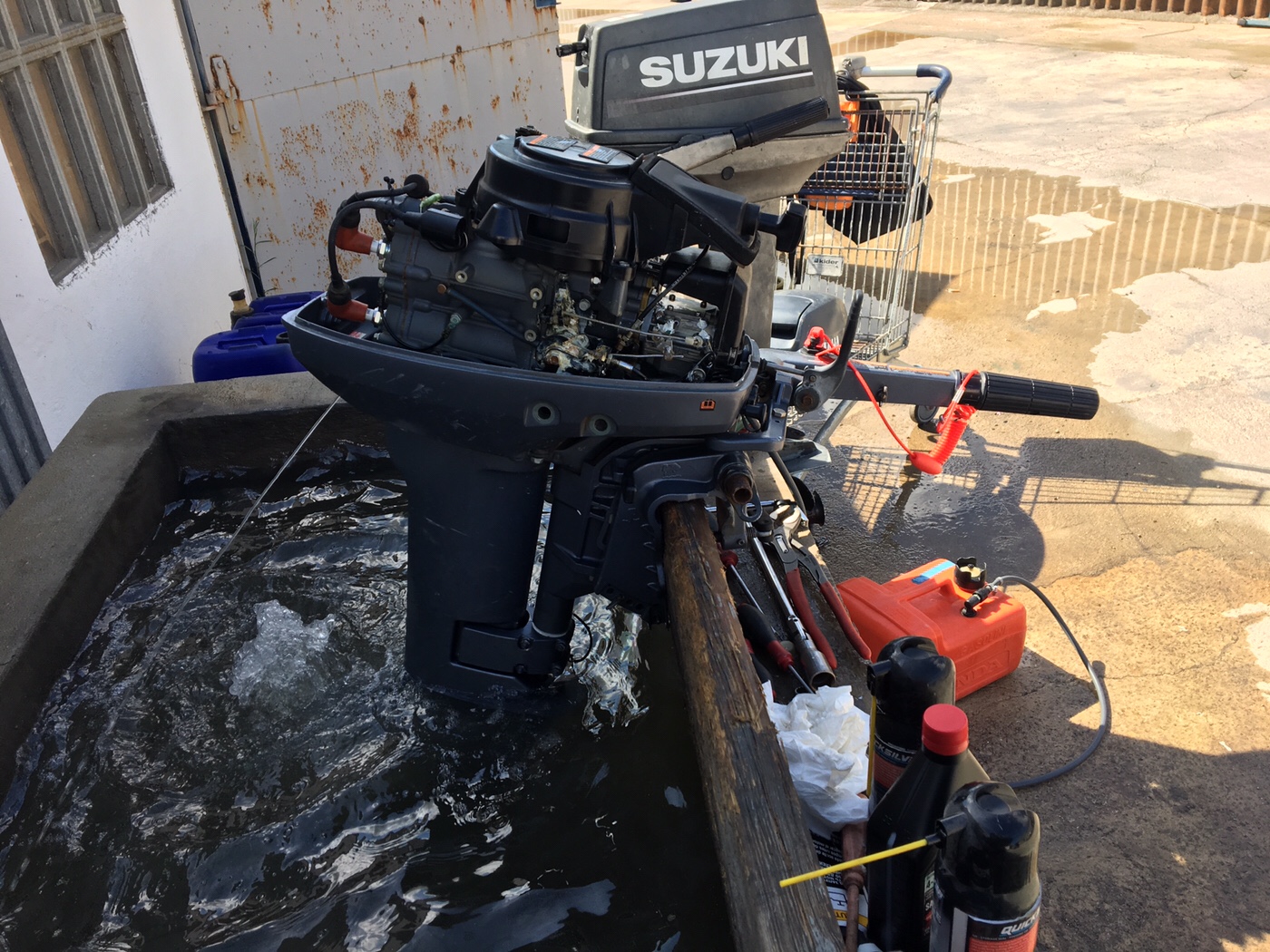 Unser Tank im Dinghy hat kräftig Wasser abbekommen. Auch im Motorraum auf der rechten Seite der Baradal war etwas Wasser reingelaufen. Letzteres war nicht schlimm, ein Lappen half. Aber der Aussenborder fiel aus. 1,5 l Wasser im 20 l Tank. Das war zu viel. Eine Reparatur stand an. Die machten wir nach einigen vergebliche Versuchen meinerseits in Polença bei einem sehr hilfreichen und kompetenten Betrieb. Ich durfte zuschauen und lernen. Der Vergaser hat doch ein paar verdeckte Düsen die gereinigt und dann eingestellt werden müssen.