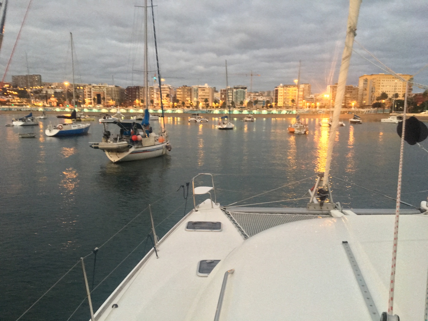 Wir liegen neben der Marina gut geschützt vor dem Stadtstrand und bewundern die Großschiffe bei ihren Manövern im Hafen.