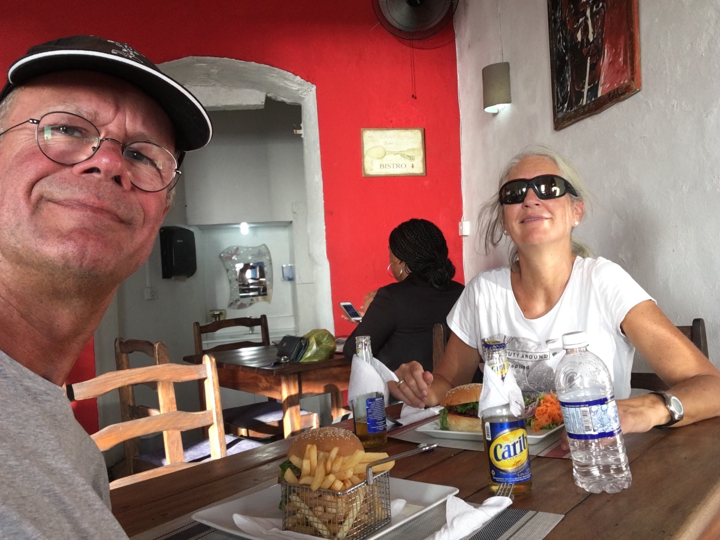 Zur Entspannung ein Marsch in den Ort und klasse eingekauft. Es gibt einen guten, neuen Supermarkt direkt am Kreuzfahrtpier. Super. Zur Belohnung ins Restaurant ” Le Petite Paris” und erstklassigen Burger 🍔 geordert. Das Leben meint es gut mit uns😊.