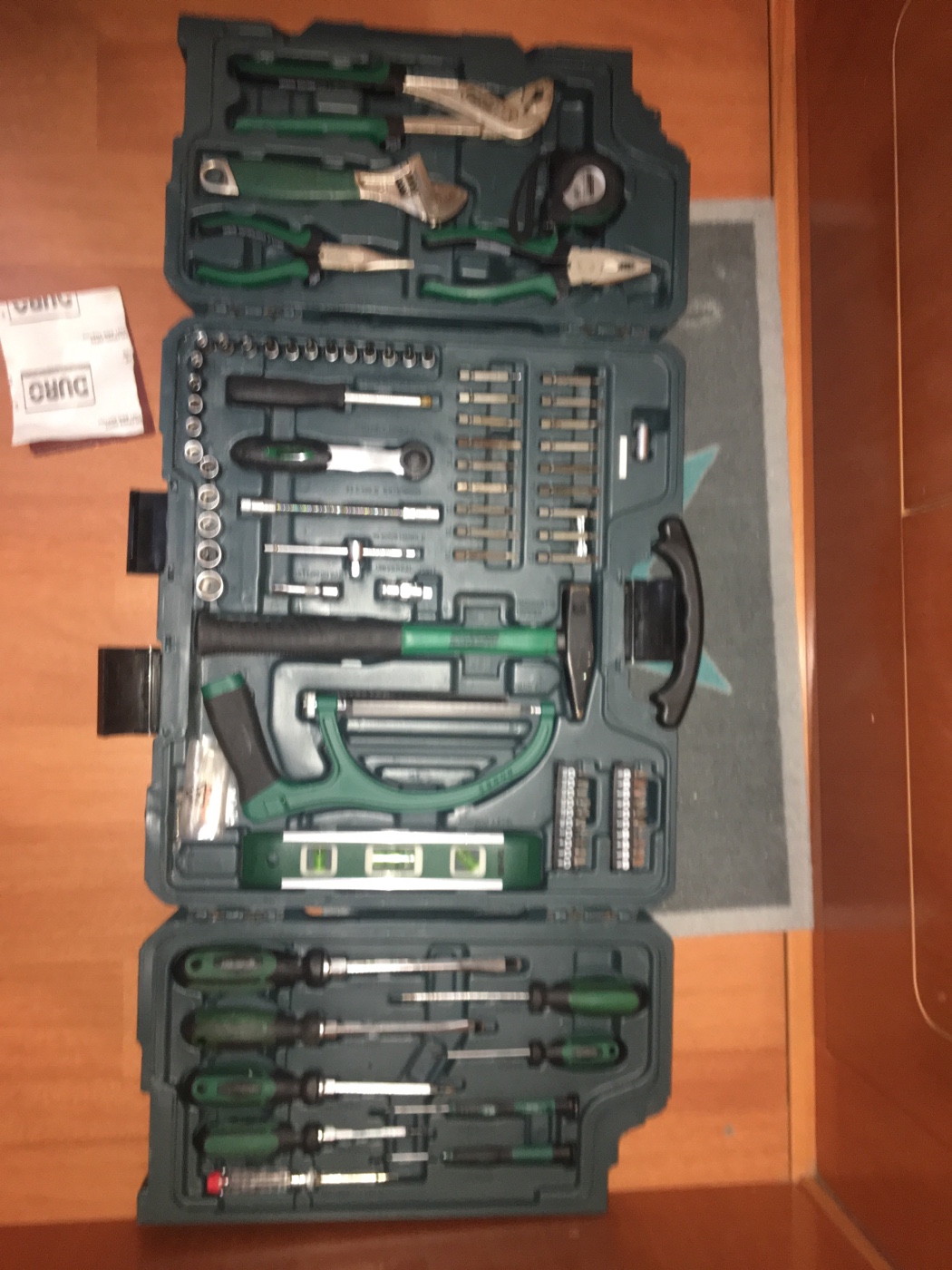 - Knarrenkasten, div. Engländer, gutes Sortiment an Schraubschlüssel, kleiner Akkuschrauber mit Winkelvorsatz und Zubehör (Lidl), Universal Deltaschleifer, Akkubaumsäge (Lidl) mit Sägeblätter für Metall und Holz in grob und fein.