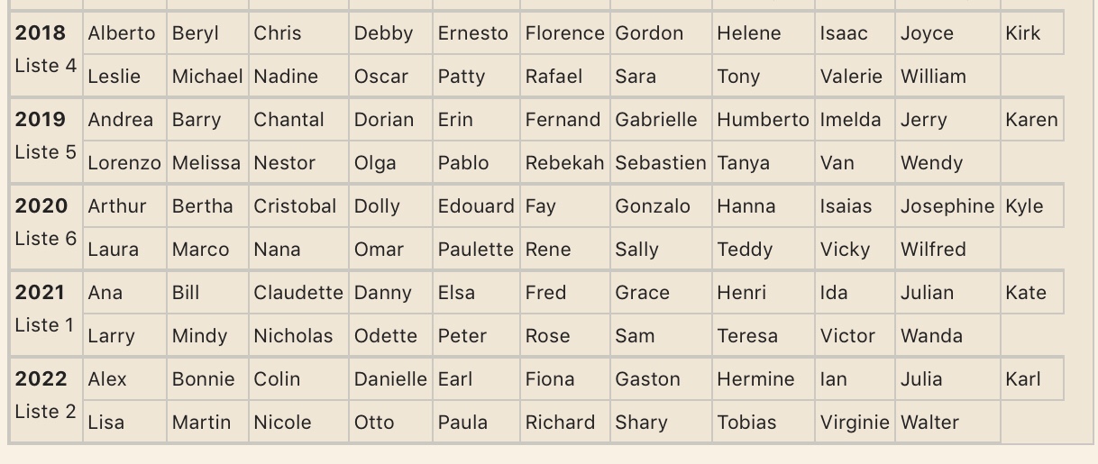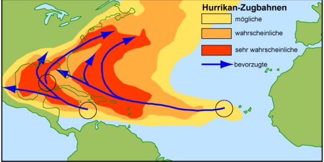 Die Namen der Hurrikans sind nach alphabetischer Reihenfolge von der amerikanischen Wetterbehörde für die nächsten Jahre festgelegt. Am Anfangsbuchstaben kann man also die Anzahl der Hurrikans einer Saison feststellen. 8-10 solcher Stürme kommen pro Saison vor.