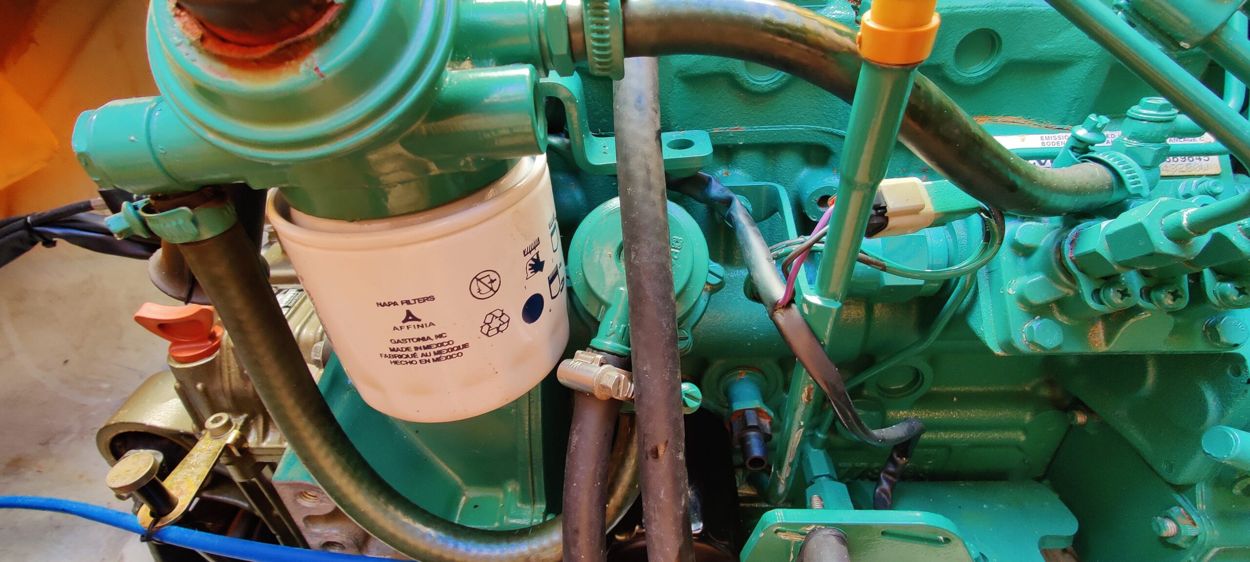 Alle OEM lieben es nicht, wenn man nicht ihre Originalteile für teures Geld kauft. Da wird mit Garantie geschwafelt und manchmal auch ein Wechsel erschwert. Volvo ist da recht geschickt. Der Diesel-Feinfilter hat einen sehr geringen Außendurchmesser. Die Vergleichsfilter sind 1- 3 mm dicker im Umfang. Und siehe da, sie passen nicht! Aber geht nicht, gibt’s nicht. Man kann einfach die Halterung für die Entlüftung der Dieselleitung (da hängt der Feinfilter dran) lösen (10 mm Schlüssel) und mit zwei Unterlegscheiben etwas Platz schaffen. Eng, aber es passt.