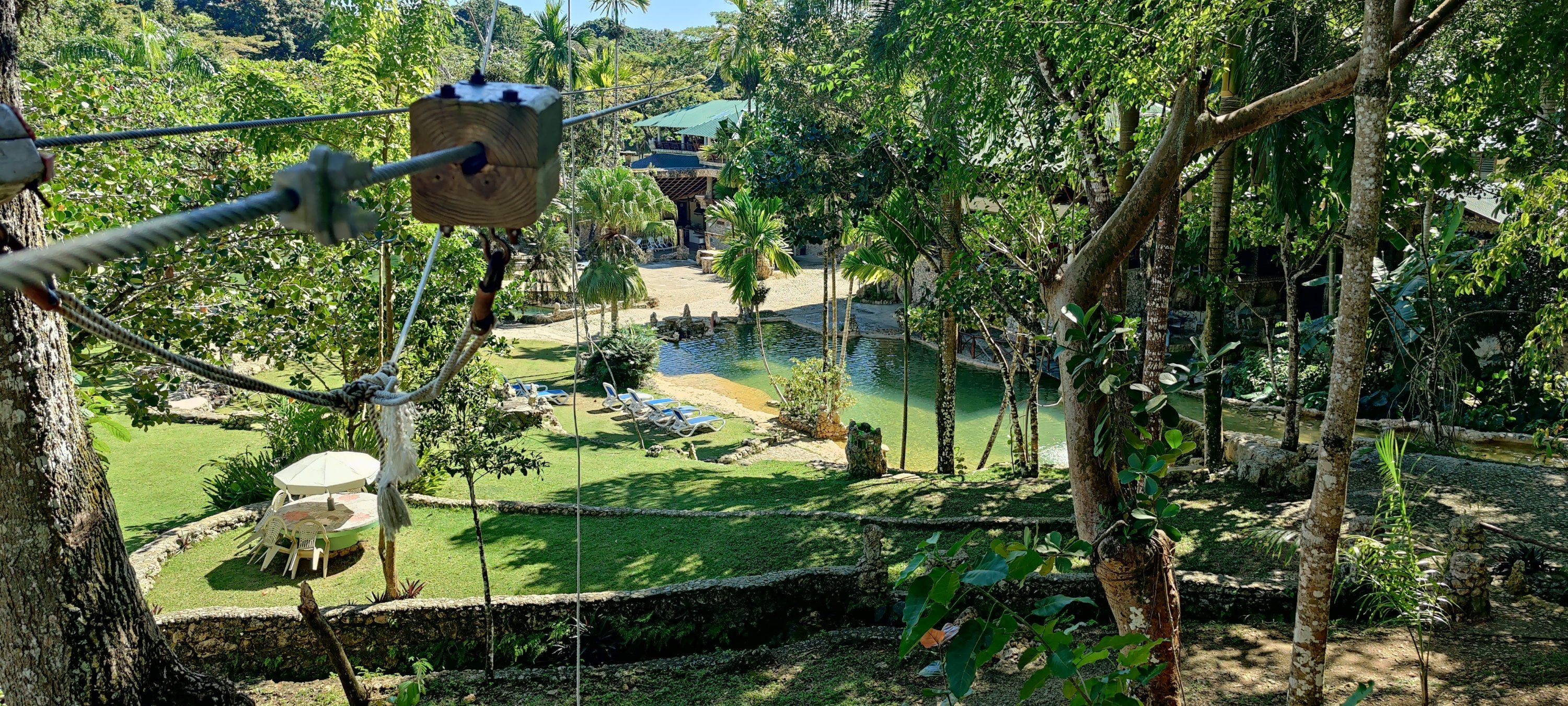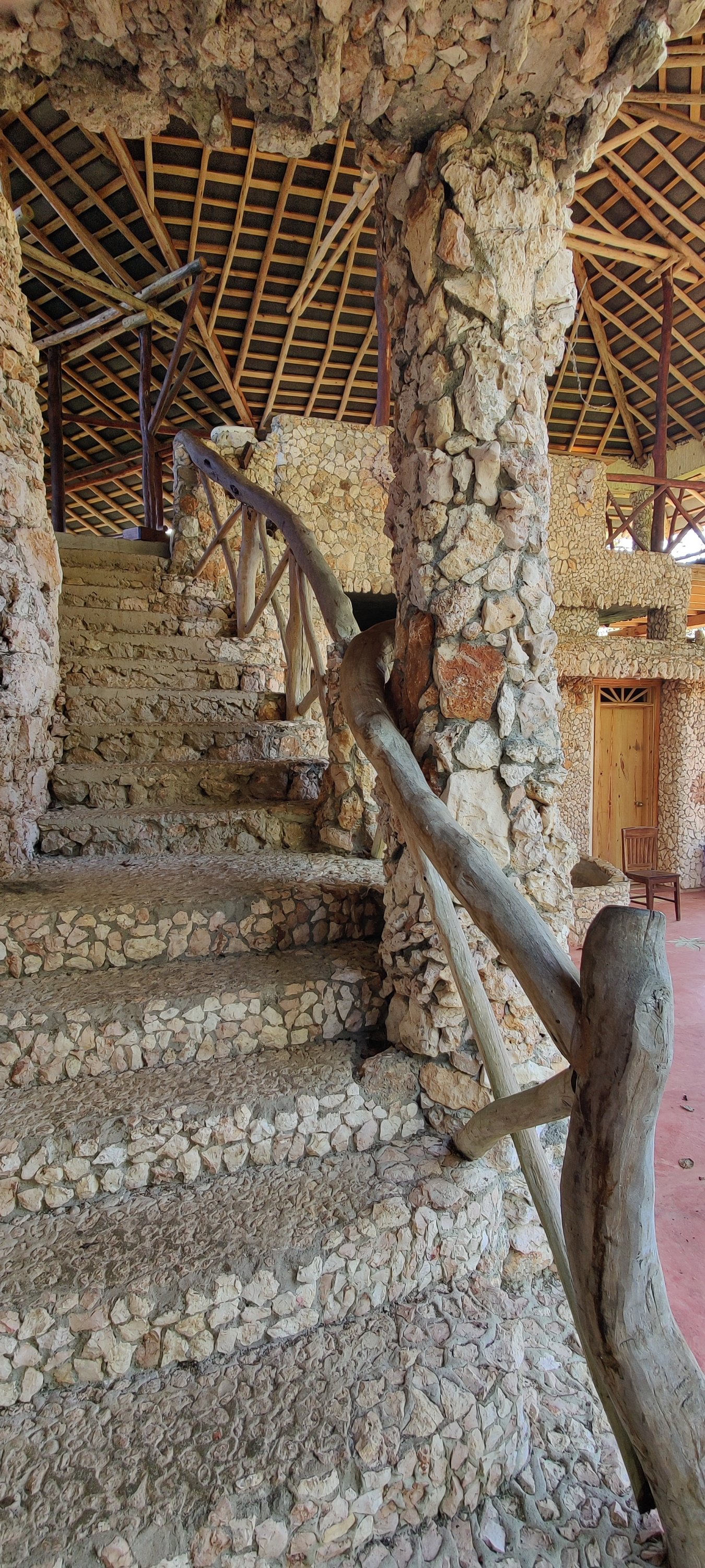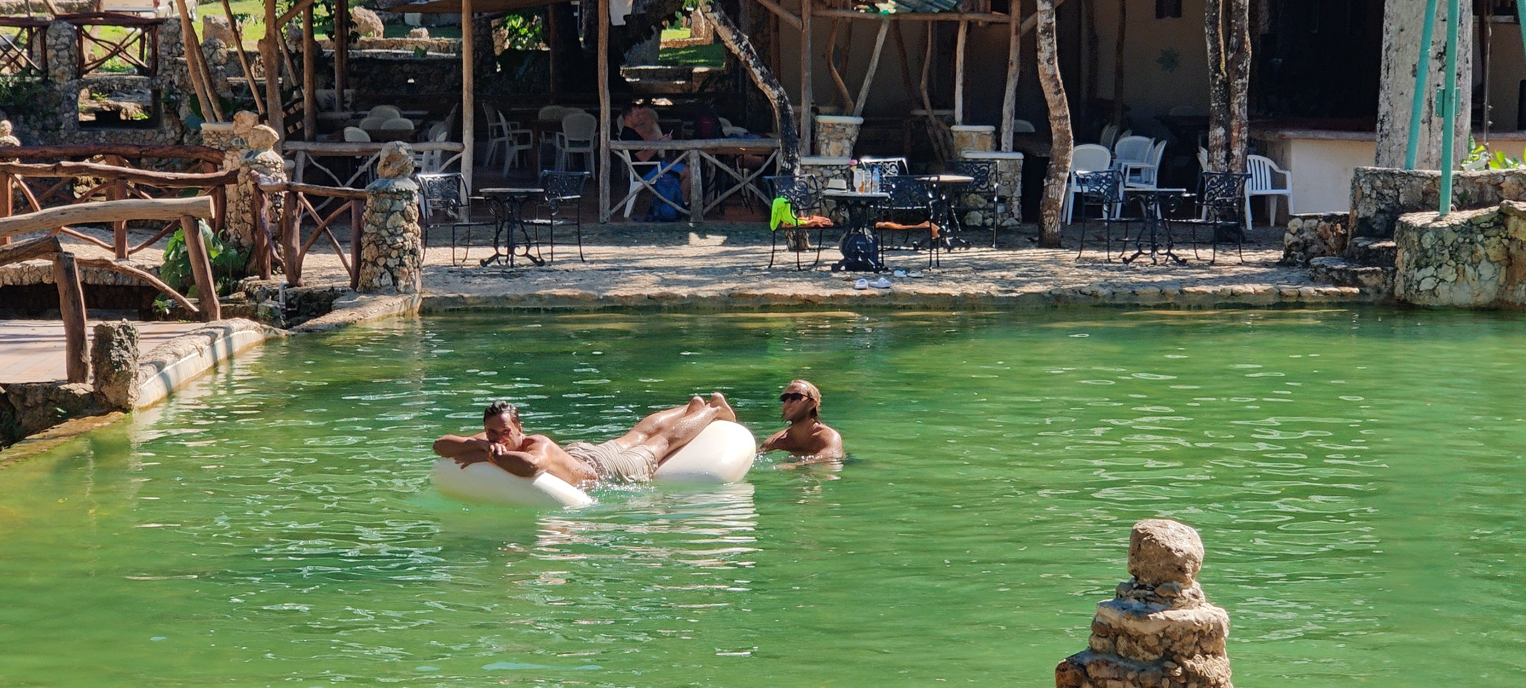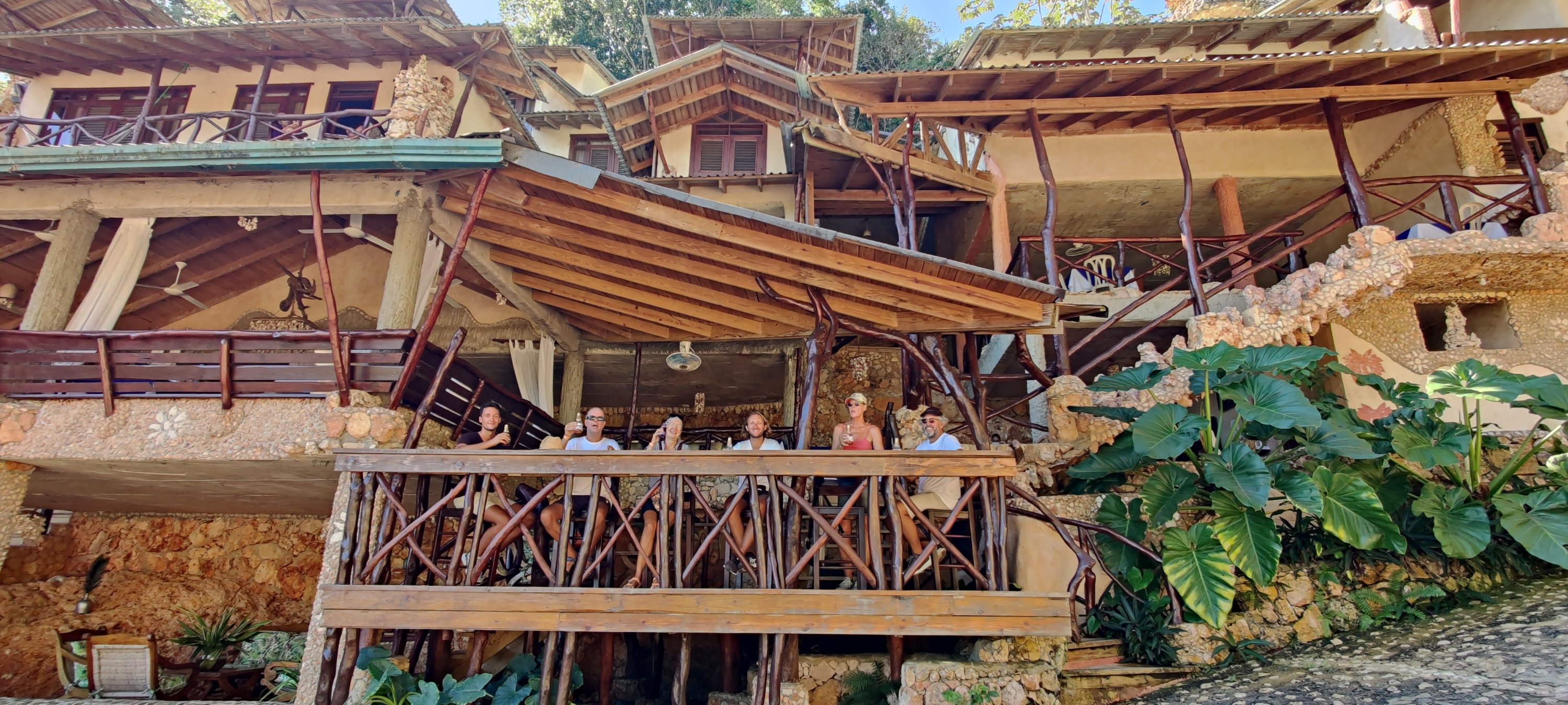 Nach kurzer Wanderung erreichten wir die Lodge. Wir sind völlig platt was wir hier sehen. Ein Gesamtkunstwerk vergleichbar mit Manrique auf Lanzarote. Die Hotelgebäude sind wie Bienenkörbe an den Hang gebaut, überall tolle Formen und Details. Wasser vom Berg fließt durch viele Kanäle und Rohre durch und um das Haus. Überall kleine Becken und Wasserfälle, bis das Wasser schließlich in die große Poolanlage fließt. Da haben wir auch nicht widerstehen können und sind nach leckerem Mittagessen ins kristall klare Wasser gesprungen. Herrlich!!