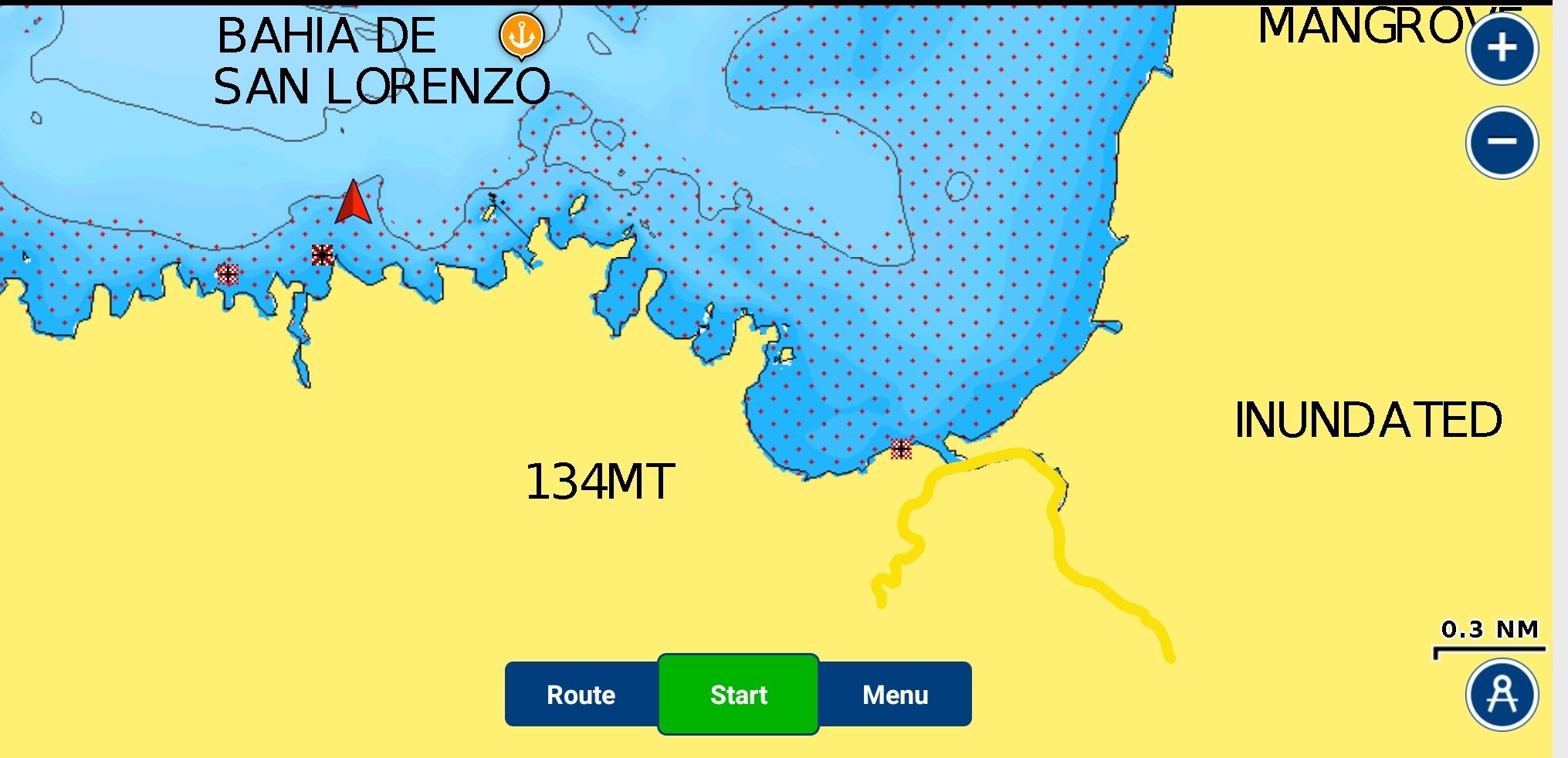 Laut Karte waren wir auf dem Festland und konnten unseren Fehler in der Navigation erkennen. Also zurück und den Abzweig richtig nehmen. Aber war schon geil, so komplett mitten im Mangrovendschungel. Nach kurzer Fahrt kamen wir an der Anlegestelle an. Dinghy fest gemacht und auf zur Lodge. (Route als gelbe Linie)