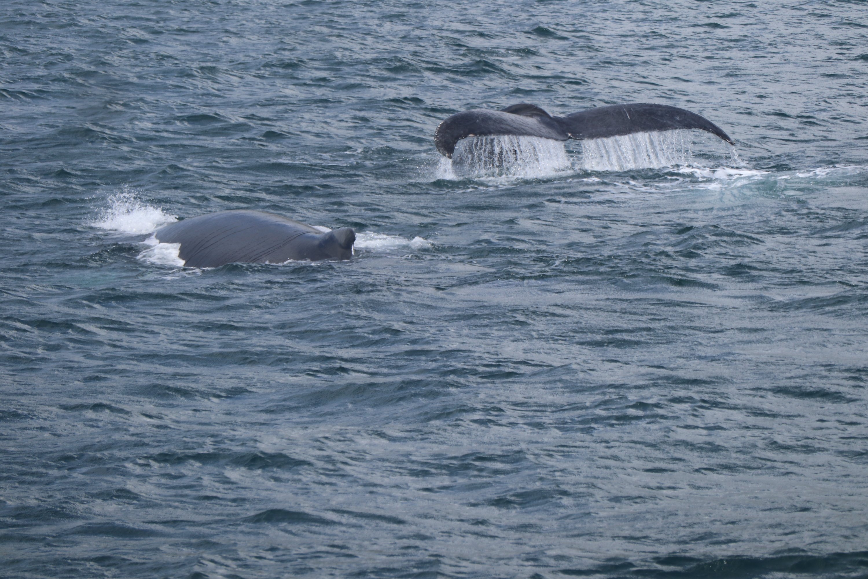 Das Beobachten ist mehr ein “Warten” und dann Staunen. Die Tiere sind ja immer zu 2/3 unter Wasser. Ach ja, das hier sind Buckelwale, weil sie beim Abtauchen einen Buckel machen. Mal endlich eine Tierbezeichnung die sinnig ist! 😂