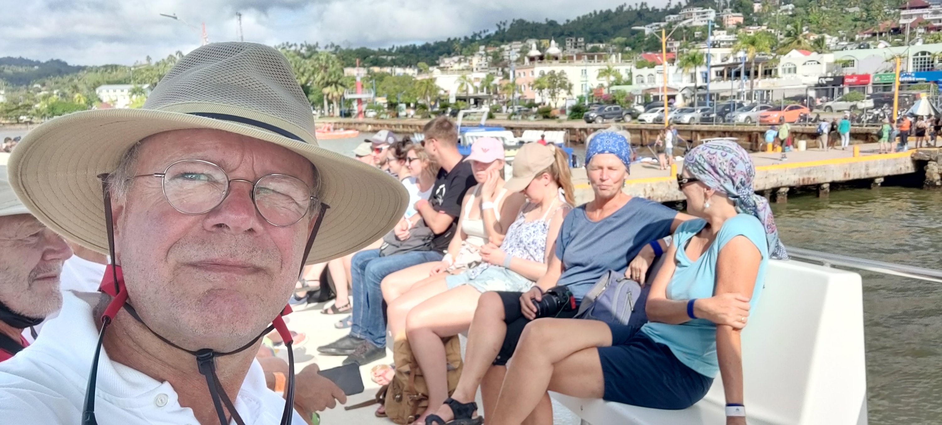 Das Wetter ist ja zur Zeit sehr durchmischt, also Wind, Welle und Regen! Es wurden also vor der Tour Kompressionsarmbänder gegen Seekrankheit verteilt. Dann wurden die Passagiere über eine Holzplanke aufs Boot befördert und los geht’s. Das schlechte Wetter der letzten Tage hat kräftig Wellen erzeugt. Also schaukelt es ganz gut. Aber die Akupressurbänder funktionieren. Ich sehe keinen die Fische füttern.