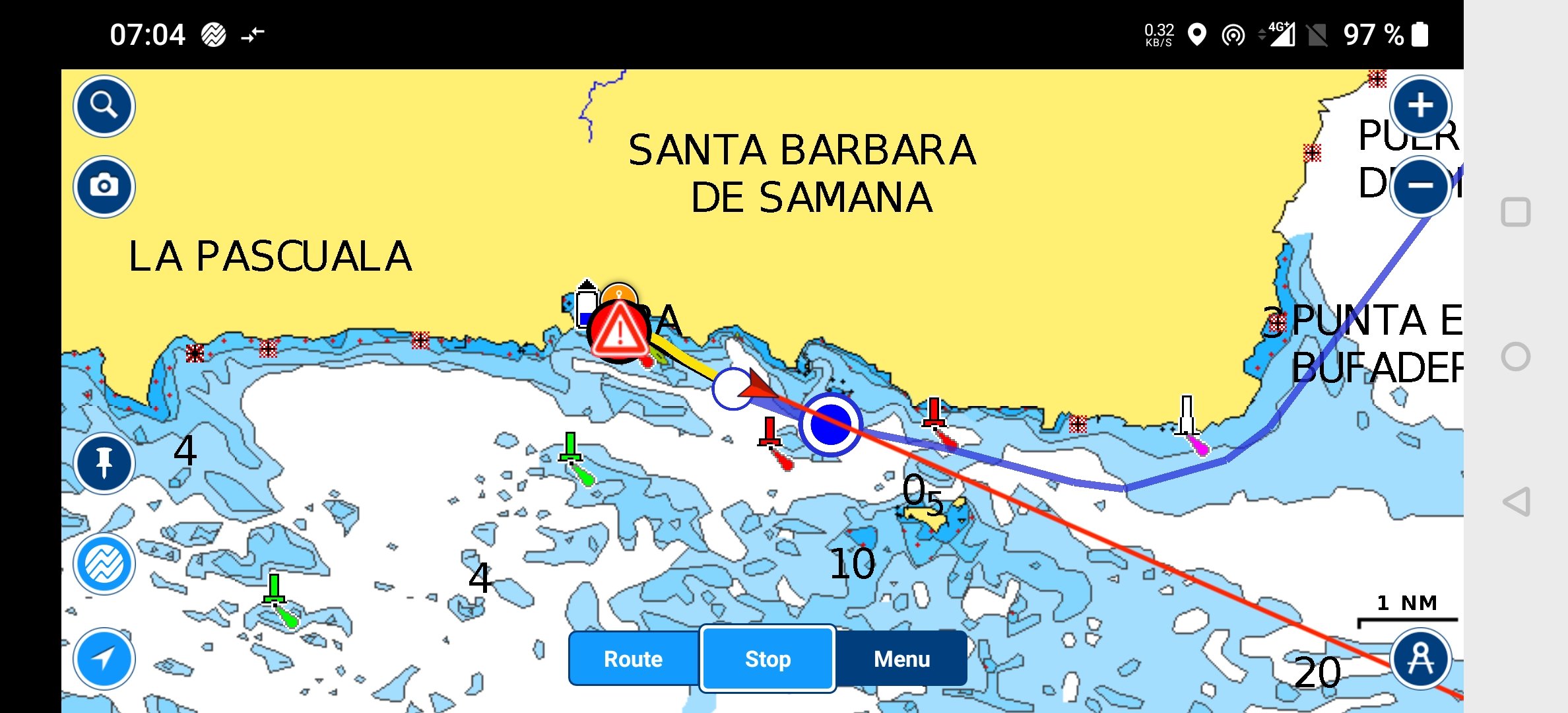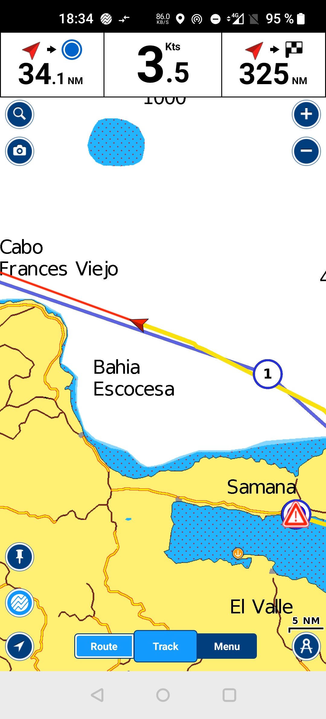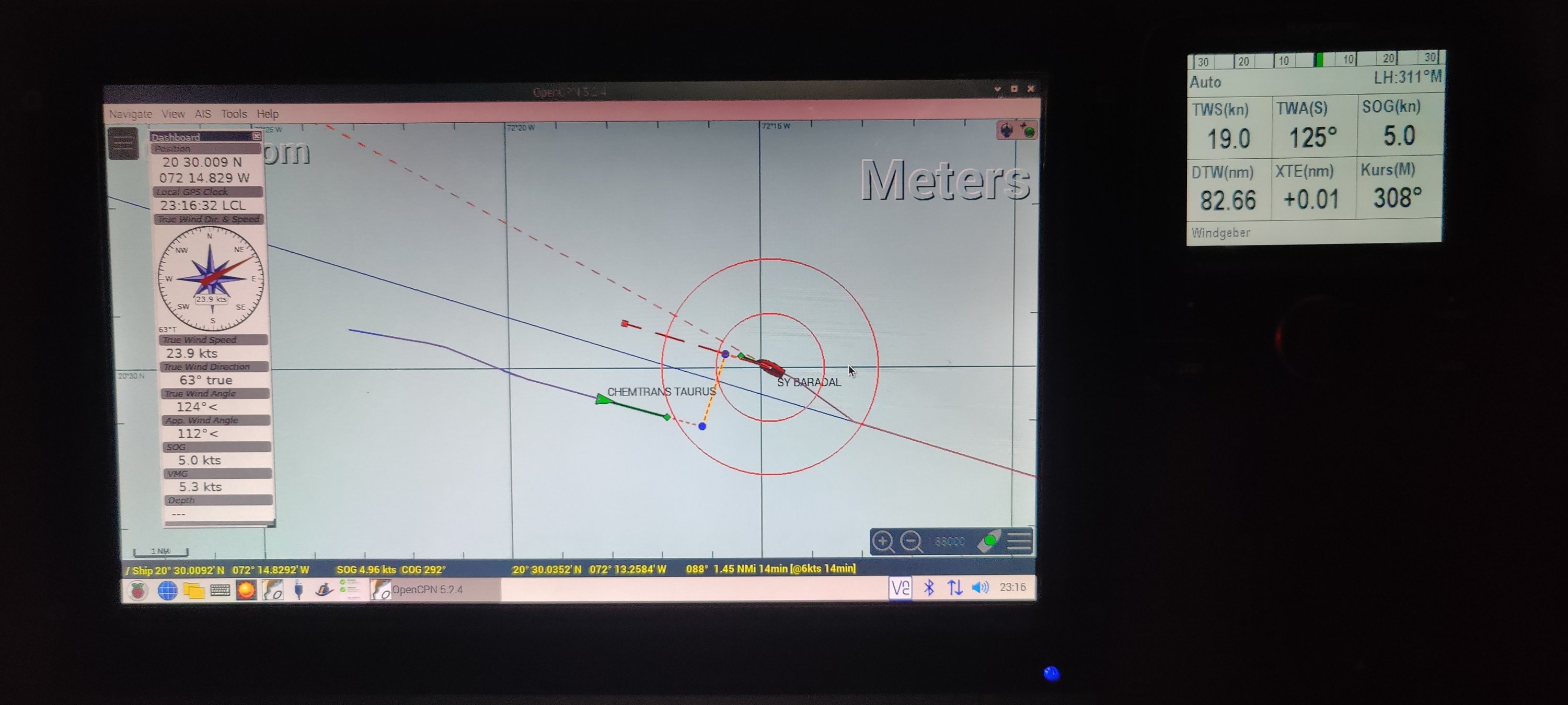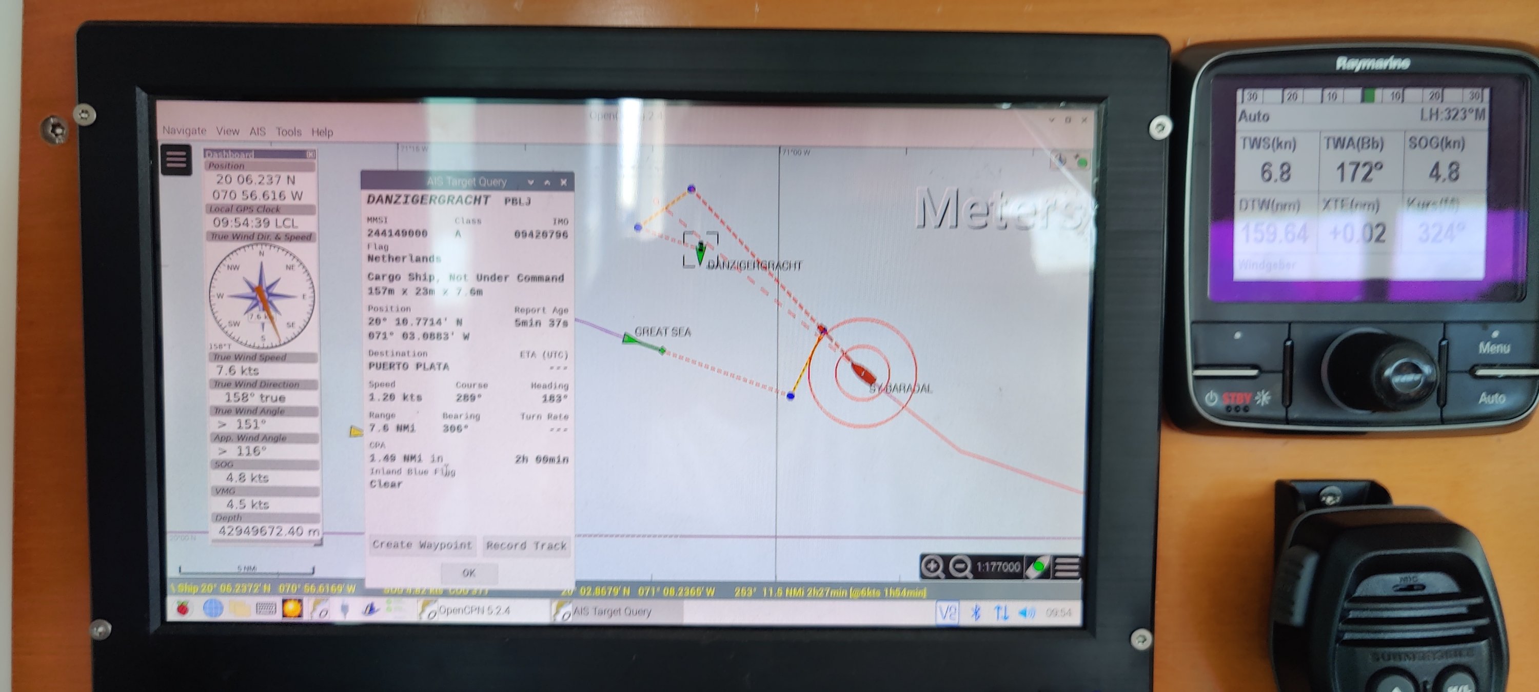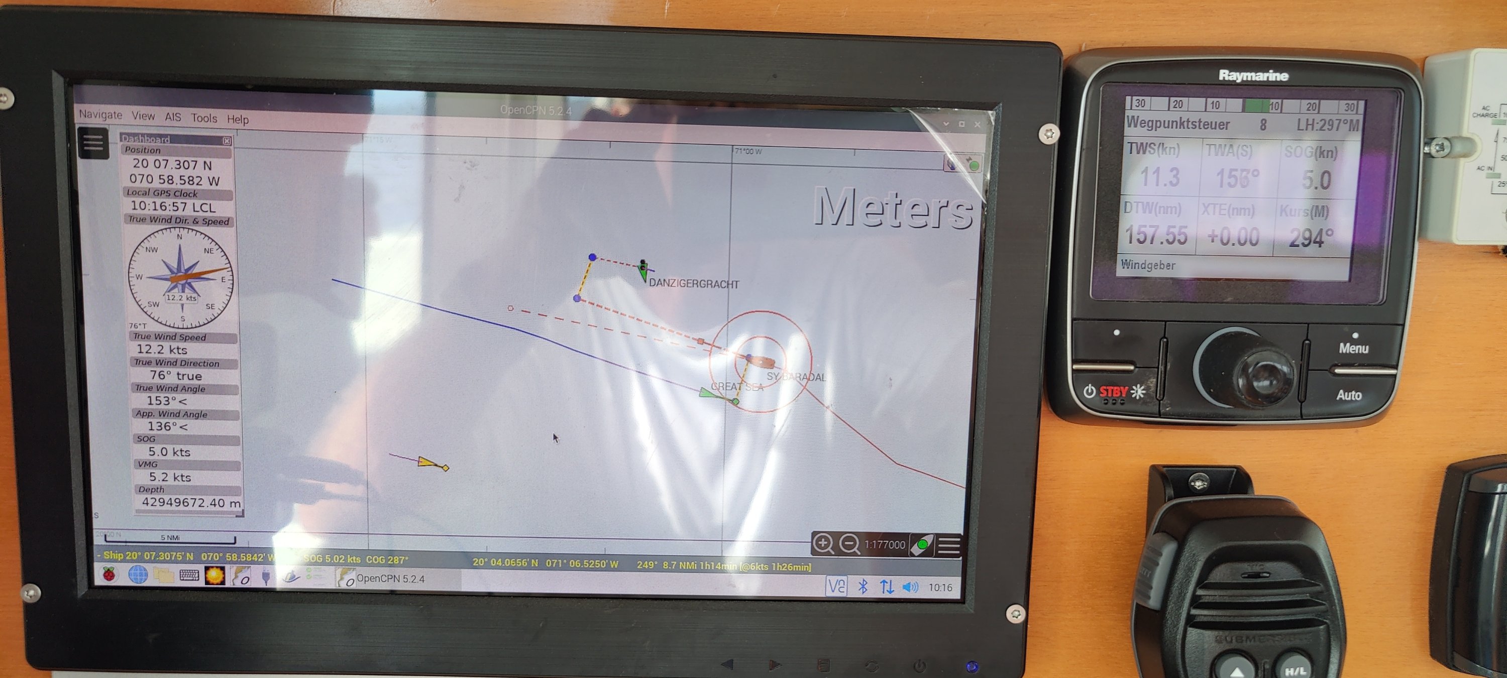Ja, und dann gibt es diese Augenblicke, da fragt man sich, ist das gut so??? Wir sehen ein schwaches Licht links vorne, nachts weit weg. Wohl ein kleines Fischerboot oder ein Haitianer auf dem Weg ins “Glück”.  Dann sehe ich eine flotte, große Yacht kommen, auf dem Monitor natürlich. Plötzlich harter Kurswechsel und einen Haken geschlagen. Kann man auf dem AIS präzise sehen. Danach habe ich das kleine Licht nicht mehr gesehen. Hoffentlich ist nix passiert.