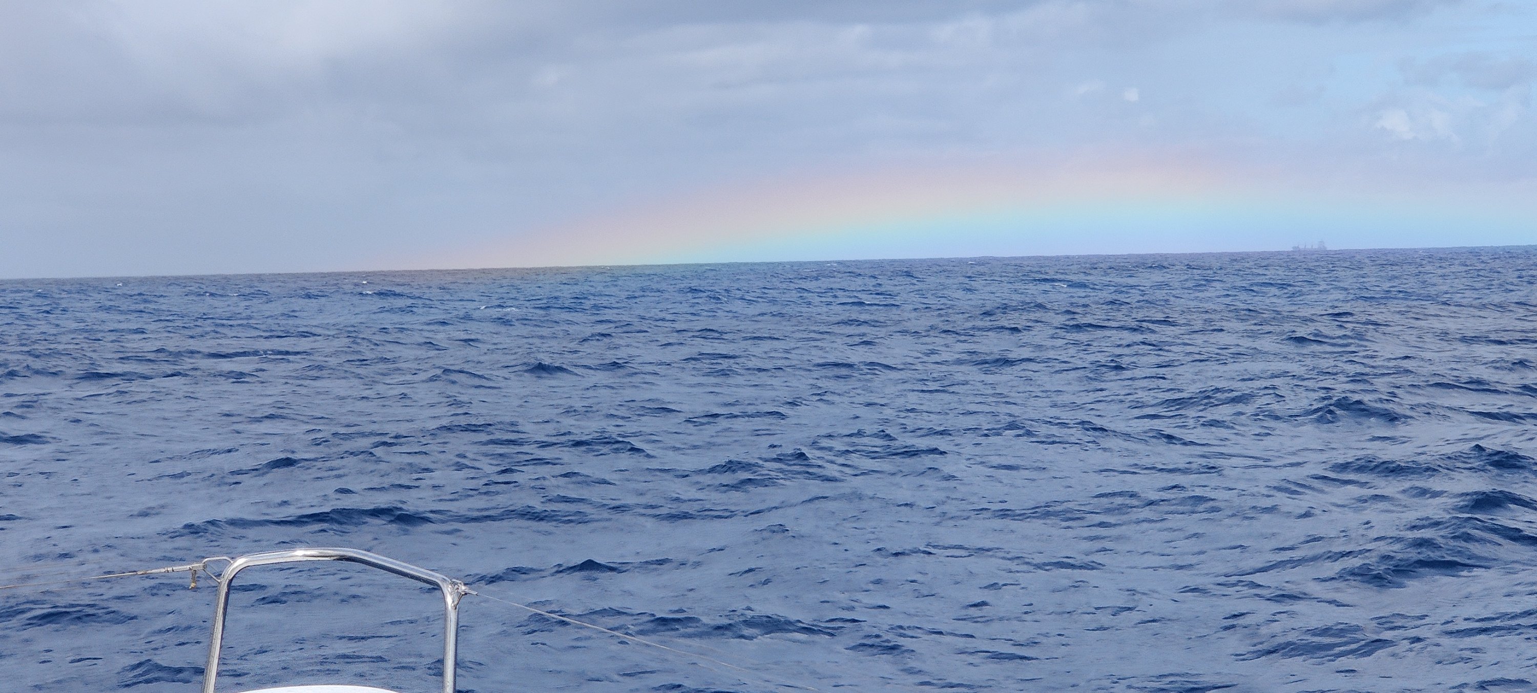 Als wollte er uns besonders gefallen, erschien der treibende Frachter unter dem flachsten Regenbogen ever.