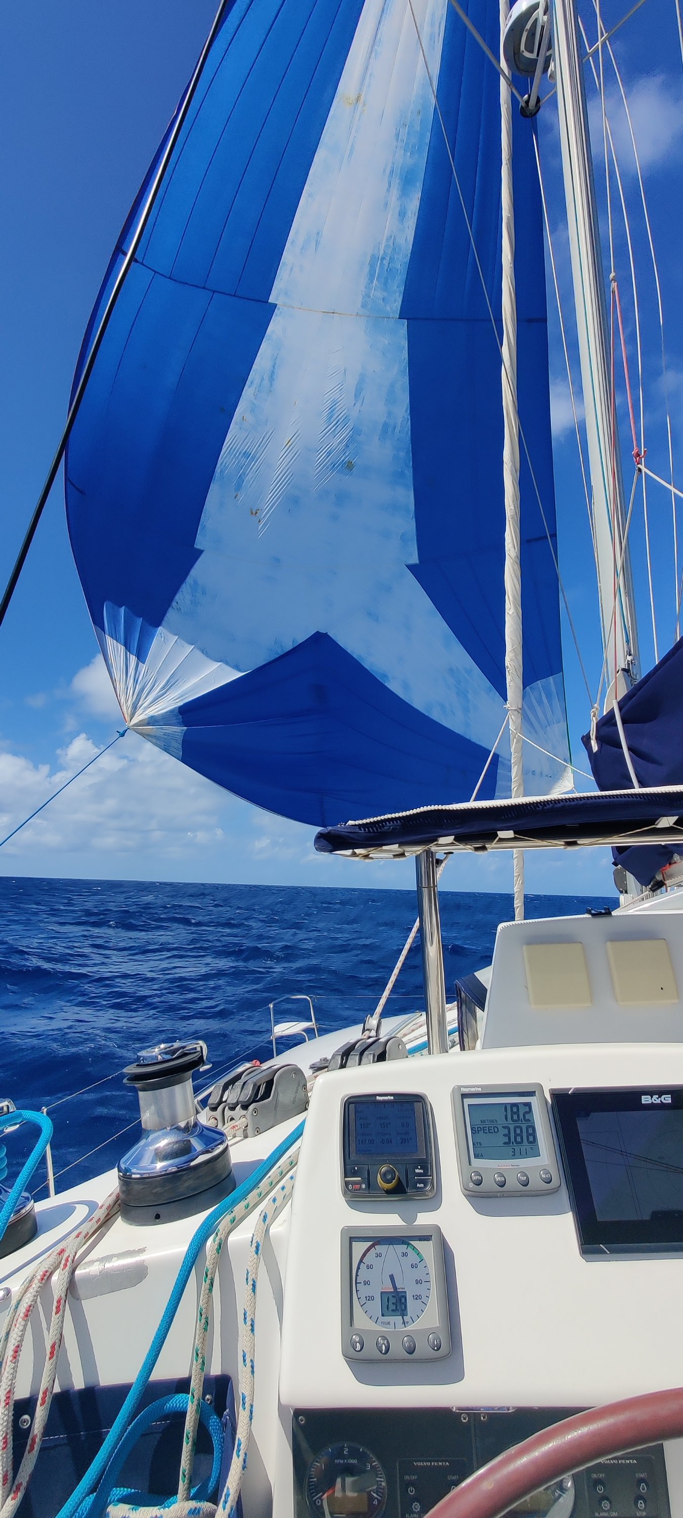 Ja, es ist wieder schön und spannend. Am nächsten Tag setzten wir den Spinnacker. Welch ein tolles Gefühl, das mag die Baradal. Flott geht’s voran.