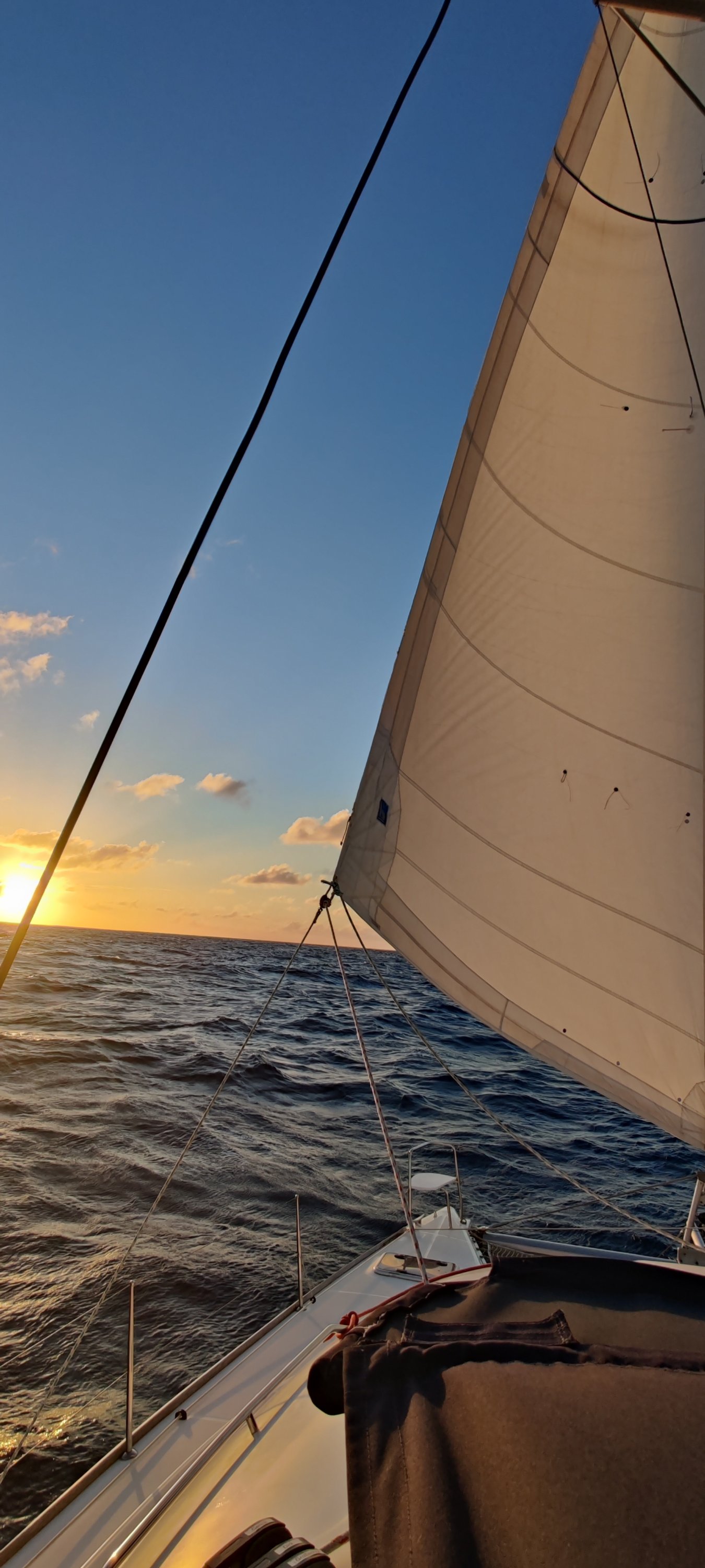 Aber der Wind frischt immer mehr auf und bei 18 kn nehmen wir den Spi wieder runter. Schön war’s, aber wir wollen es auch nicht übertreiben. Die großen Atlantikwellen verschieben uns kräftig und wir eiern wie betrunken gen Westen. Mit der Genua geht’s dann entspannt in den Sonnenuntergang.