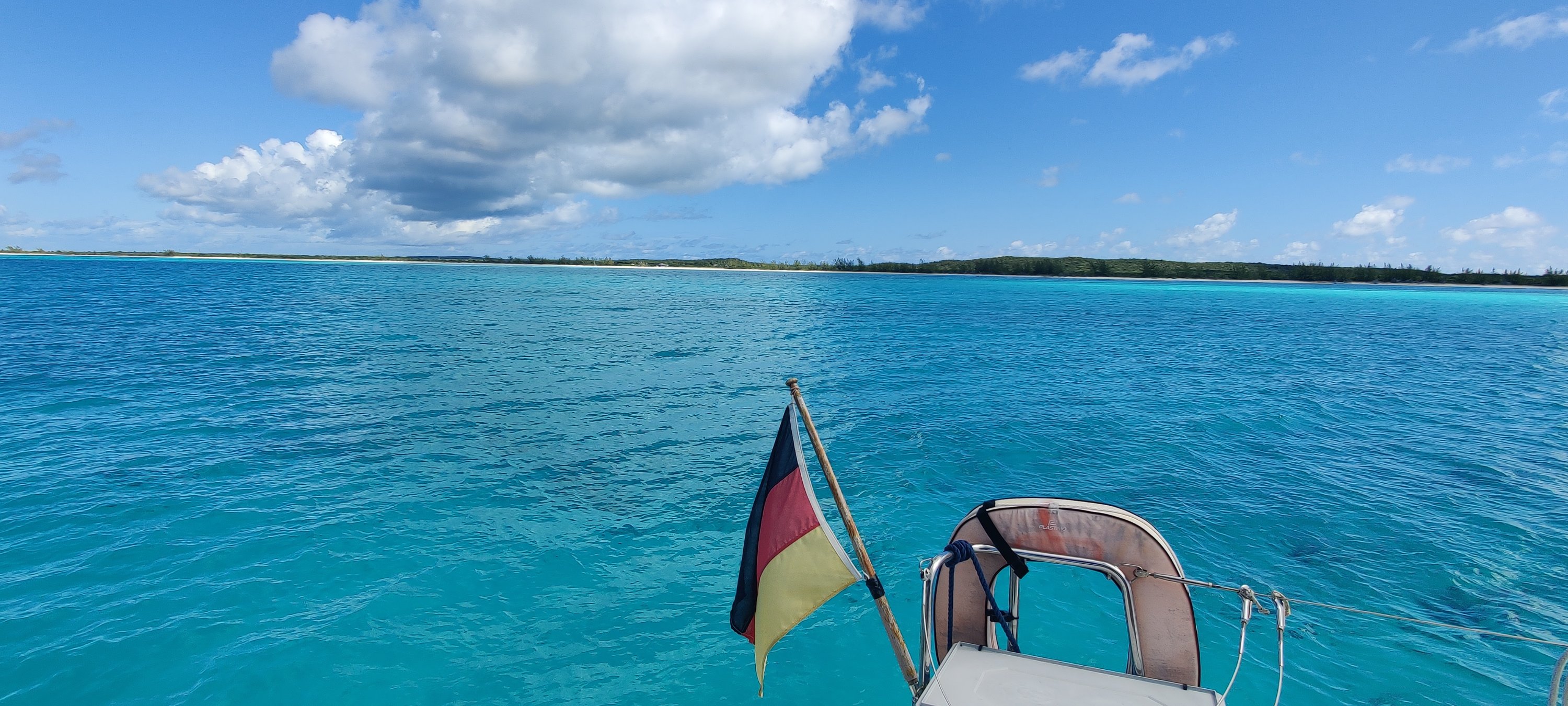 Von Hogsty ging es ja früh morgens im ersten Morgenlicht nach Acklins Island zur Jamaica Bay. Dort hatten wir zwar kristallklares Wasser und türkisen Grund, aber das war nur mit Sand gepuderter Felsen. Oh jeh. Da hält kein Anker. Und es war ja schon 16:00 Uhr! Zum Glück hat sich unser Anker hinter einem Felsen verklemmt und mit aktivem Ankeralarm ( heult auf, wenn das Boot eine bestimmte Strecke bewegt wird) haben wir doch gut geschlafen. Kein Wunder, wir hatten es nötig .