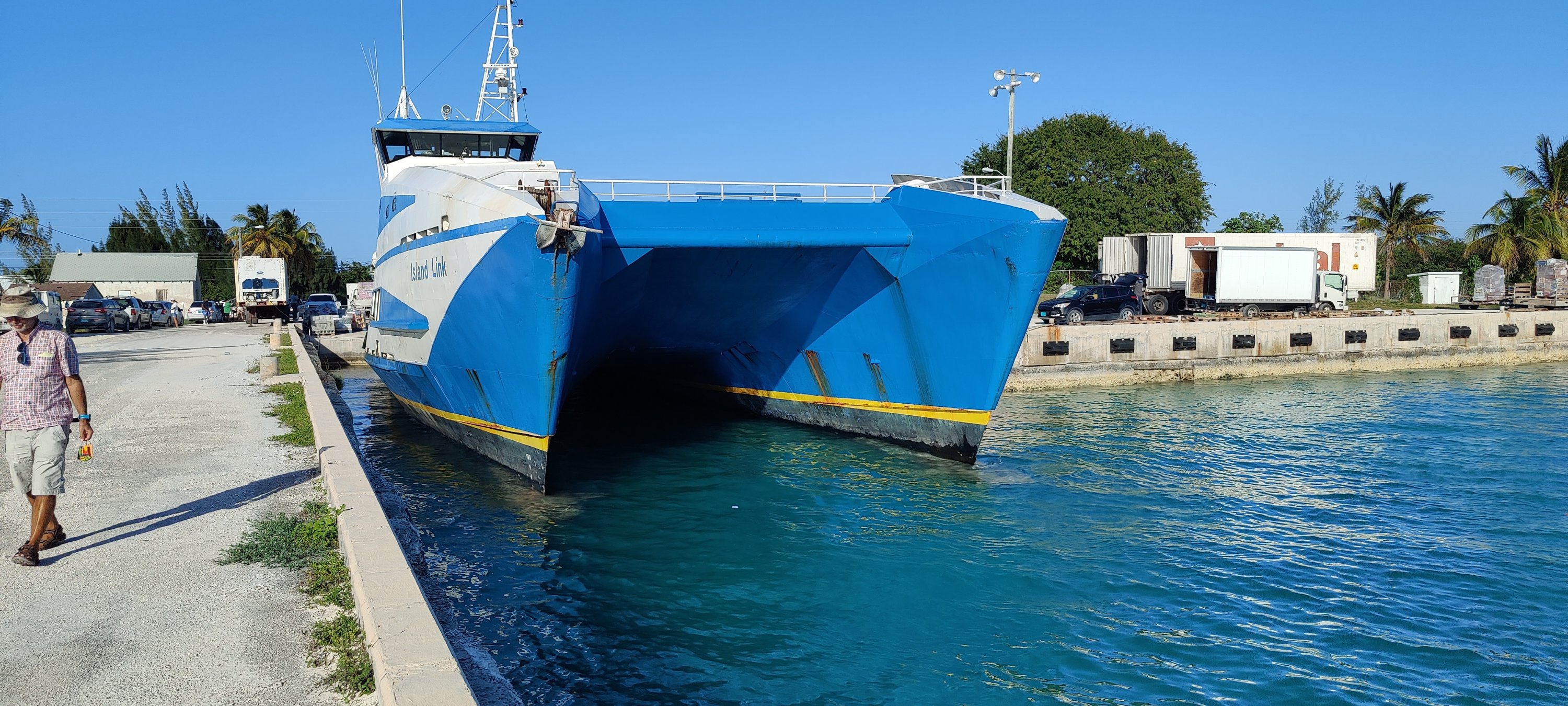 Ja, wenn das Versorgungsschiff kommt ist es immer klasse..da lebt die Insel auf. Es ist wie ein kleines Weihnachten. Einmal die Woche halt. Alles wird per Schiff angefahren. Es geht ja nicht anders. So stehen die hoffnungsvollen Empfänger und warten auf die Übergabe ihrer bestellten Ware. Das wird sorgsam vom Agenten des zuständigen “Forwarders” überwacht und notiert. Soll ja nix falsch ankommen. Nun denn, für Toni lohnt sich wohl das Geschäft, seine Goldzähne sind dafür ein eindruckvoller Beleg.