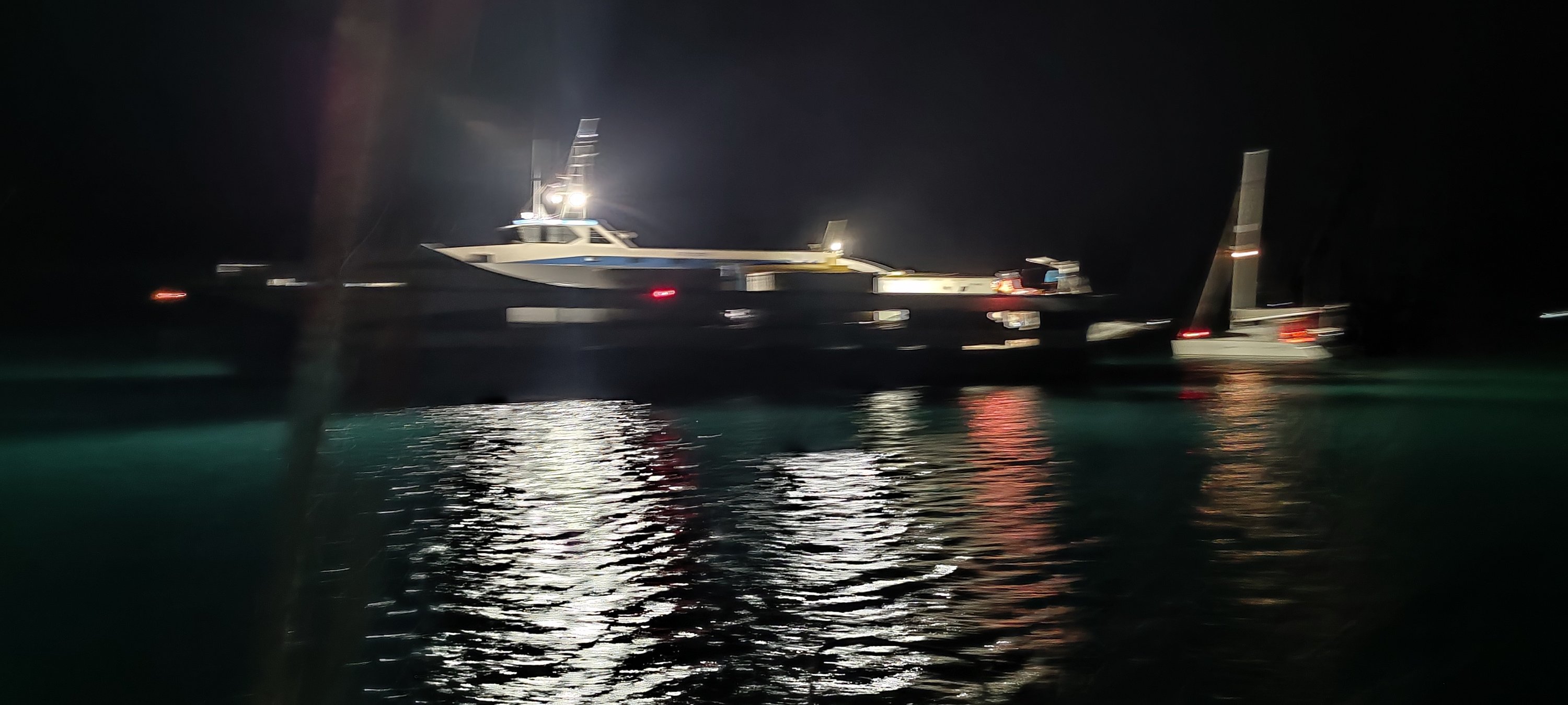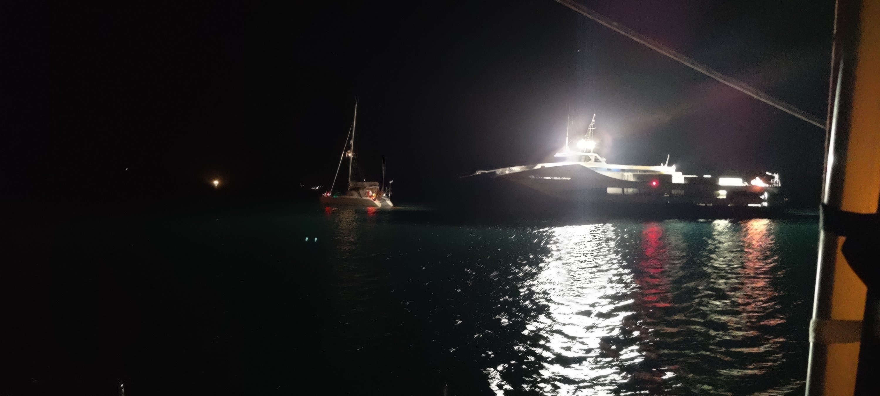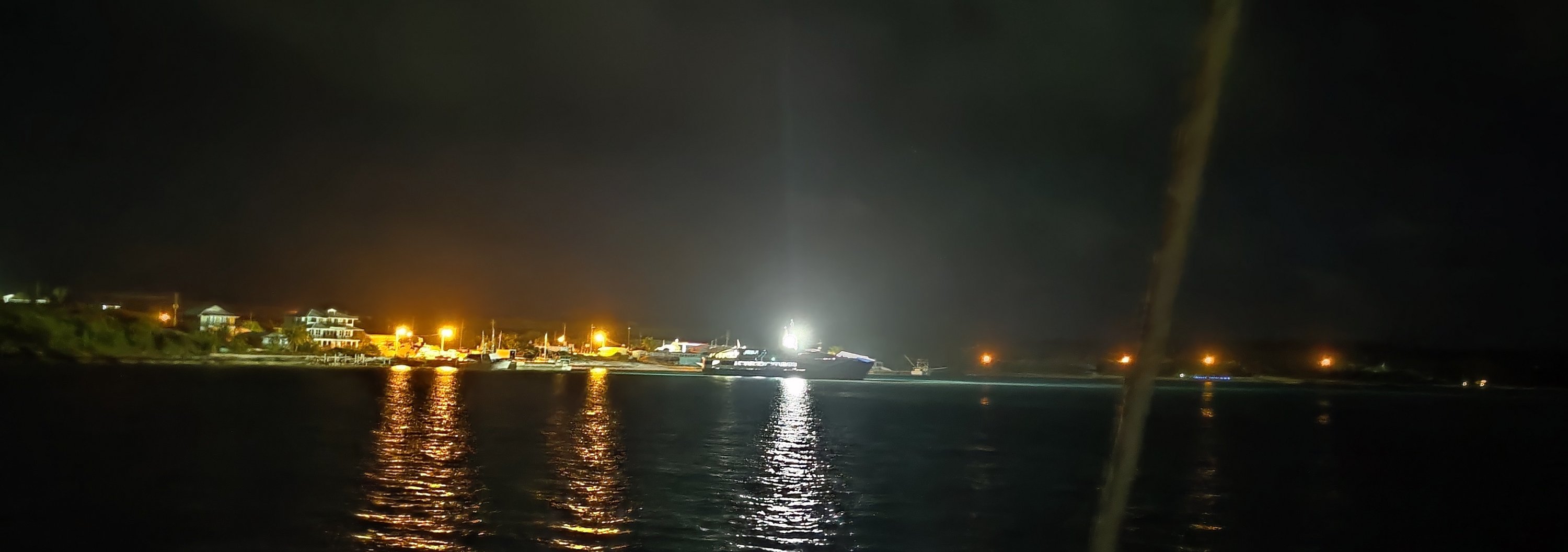 Der Captain des RoRo war tiefenentspannt. Zuerst ist er auf flachen Grund aufgelaufen, dann, nach ca 45 min kam er frei. Danach alles easy. Es war aber wirklich wenig Wasser in der bay. Wir haben natürlich schuldbewusst schnell umgeankert. Im Stockdunklen ist man froh einen Track zu haben und die Spur des Tiefenmessers in der Karte. Alles nur nach Karte machbar aber null problemo. Wieder was gelernt. 👍🌈😊🍻