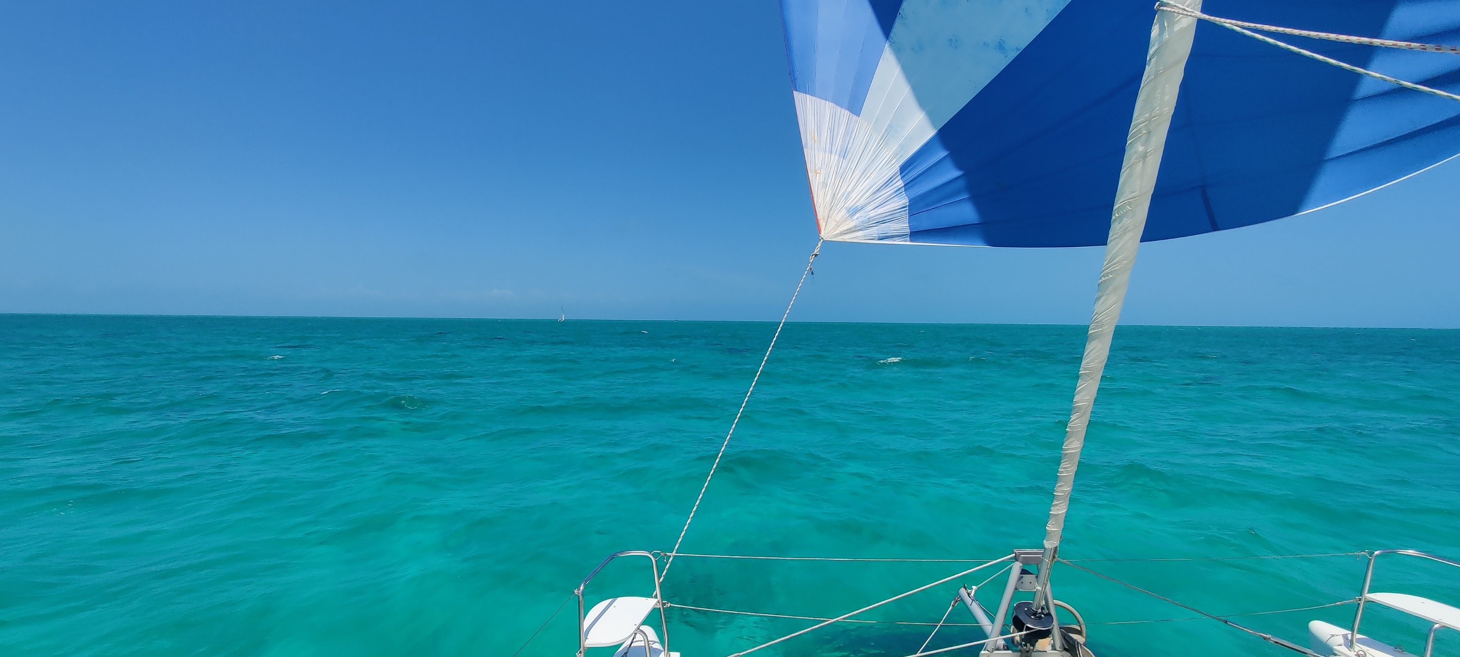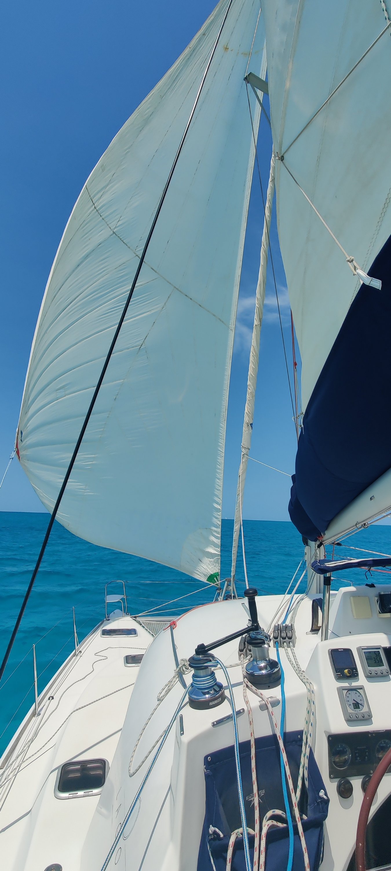 Auf der Tour nach Warderick Wells Cay haben wir endlich nach 3 Jahren unseren Gennaker, ein sehr großes, leichtes Vorsegel, mal wieder eingesetzt. Das ist mit etwas Aufwand verbunden, da es normal im vorderen Rumpf unter Deck ruht. Es sieht ja wirklich nicht mehr toll aus: das Weiss ist etwas schmuddelig, der Vorbesitzer hat Rostflecken verteilt. Aber der Zug wenn er denn im Wind steht, das ist schon geil!  Und es hat sich gelohnt: wunderbares Segeln auf schönstem Wasser. Kaum Wellen und angenehme Brise von hinten rechts.
