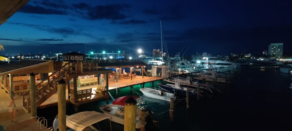 Vor Rose Island bleiben wir übers Wochenende. Morgens werden wir durch einen Hahnenschrei geweckt und später durch die Ausflugsboote nett beschallt. Am Montag gibt es die Pässe mit frischen US-Visa für Sabine und Zoltan bei DHL zur Abholung. Also tuckern wir Sonntagnachmittag nach Nassau downtown. Unsere Anfrage in der Marina bleibt auch heute wieder erfolglos, also ankern wir. Abends geht es mit dem Dinghy an Land. Das ist diesmal super relaxed. Eine Marina wird aktuell nicht genutzt, eine Renovierung steht an. Somit ideal für uns mit komfortabler Leiter zum hochklettern.