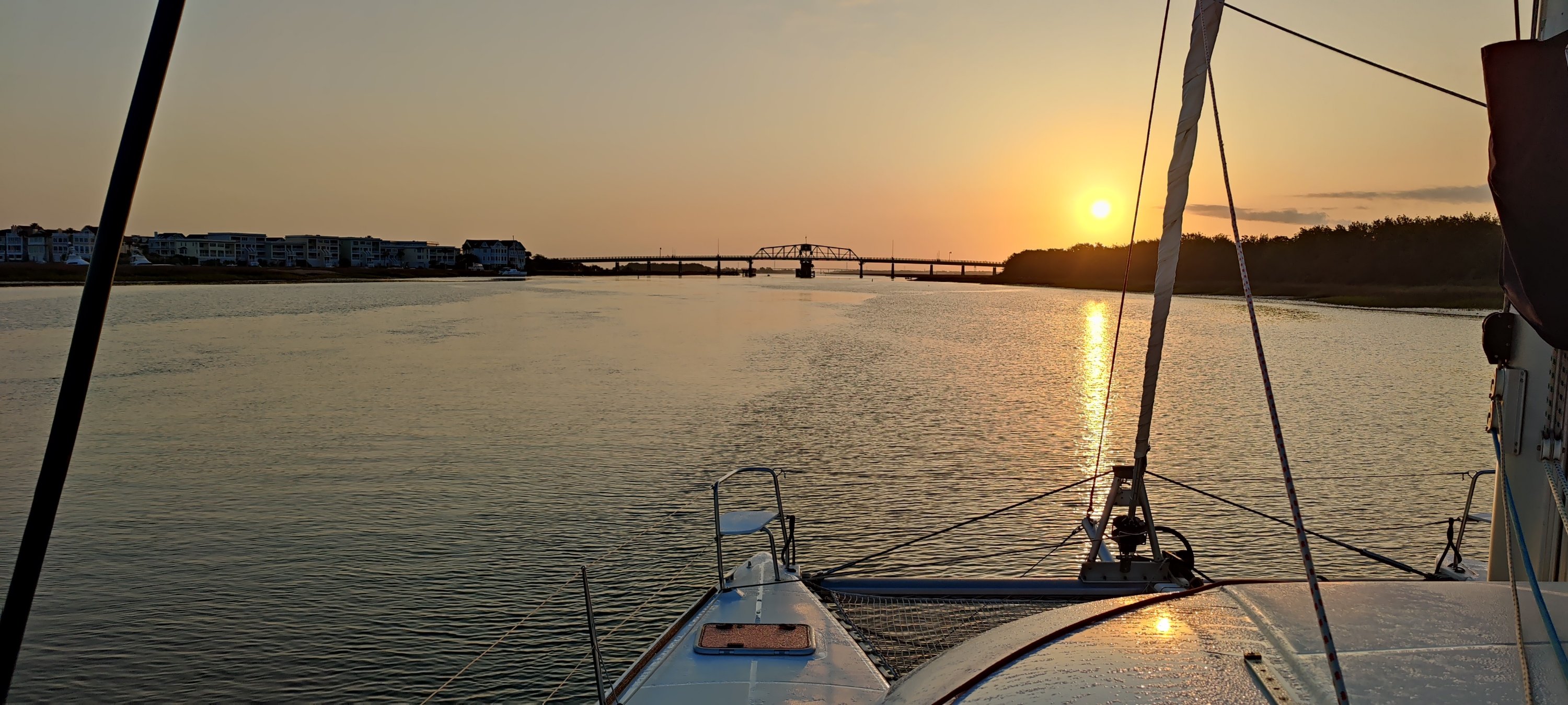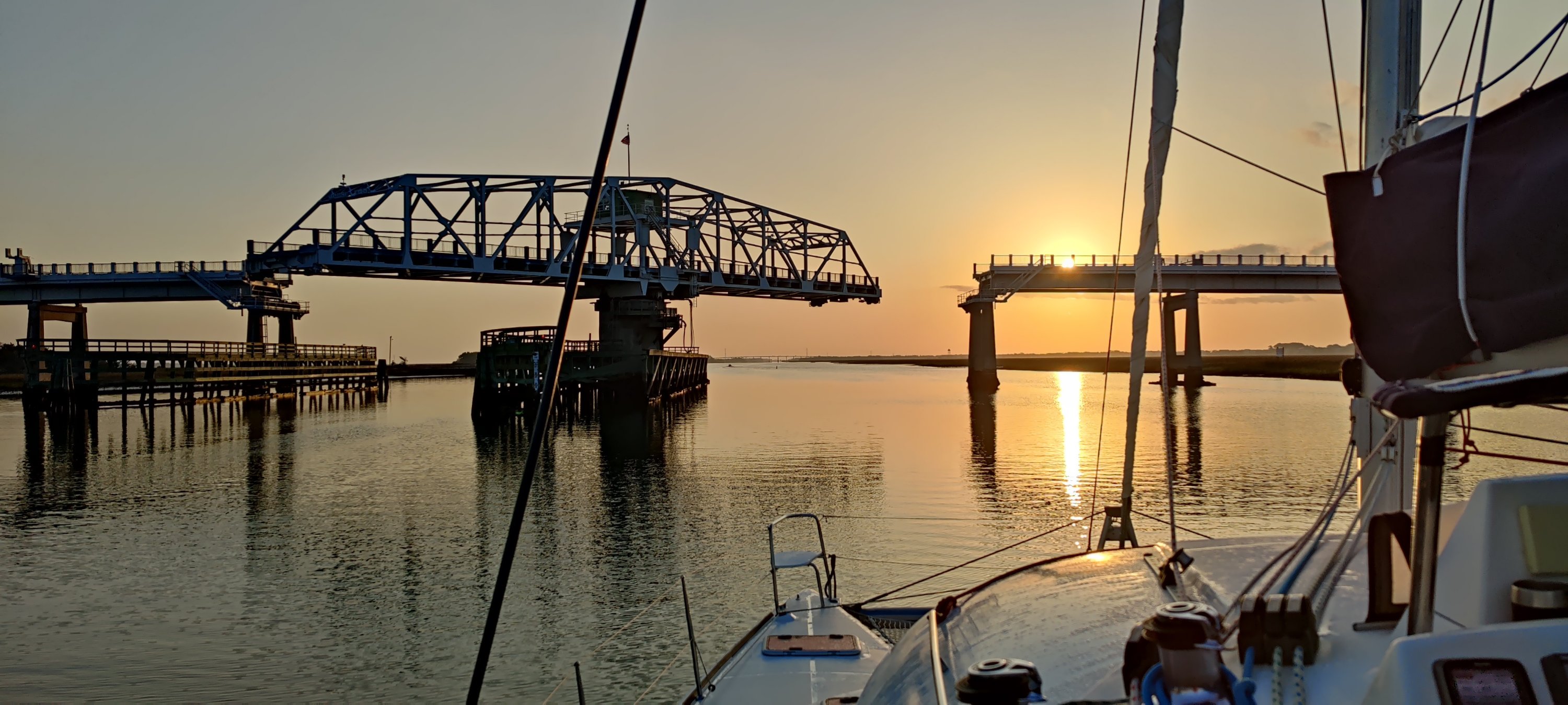 Kees hat die erste Stunde das Ruder übernommen und uns entspannt durch den Hafen und in den ICW gesteuert. Direkt am Anfang ist eine Drehbrücke. Eigentlich erst ab 9:00 Uhr regelmäßig geöffnet. Aber ein netter Funkspruch und schon wird diese Brücke für uns geöffnet. Sehr freundlich!