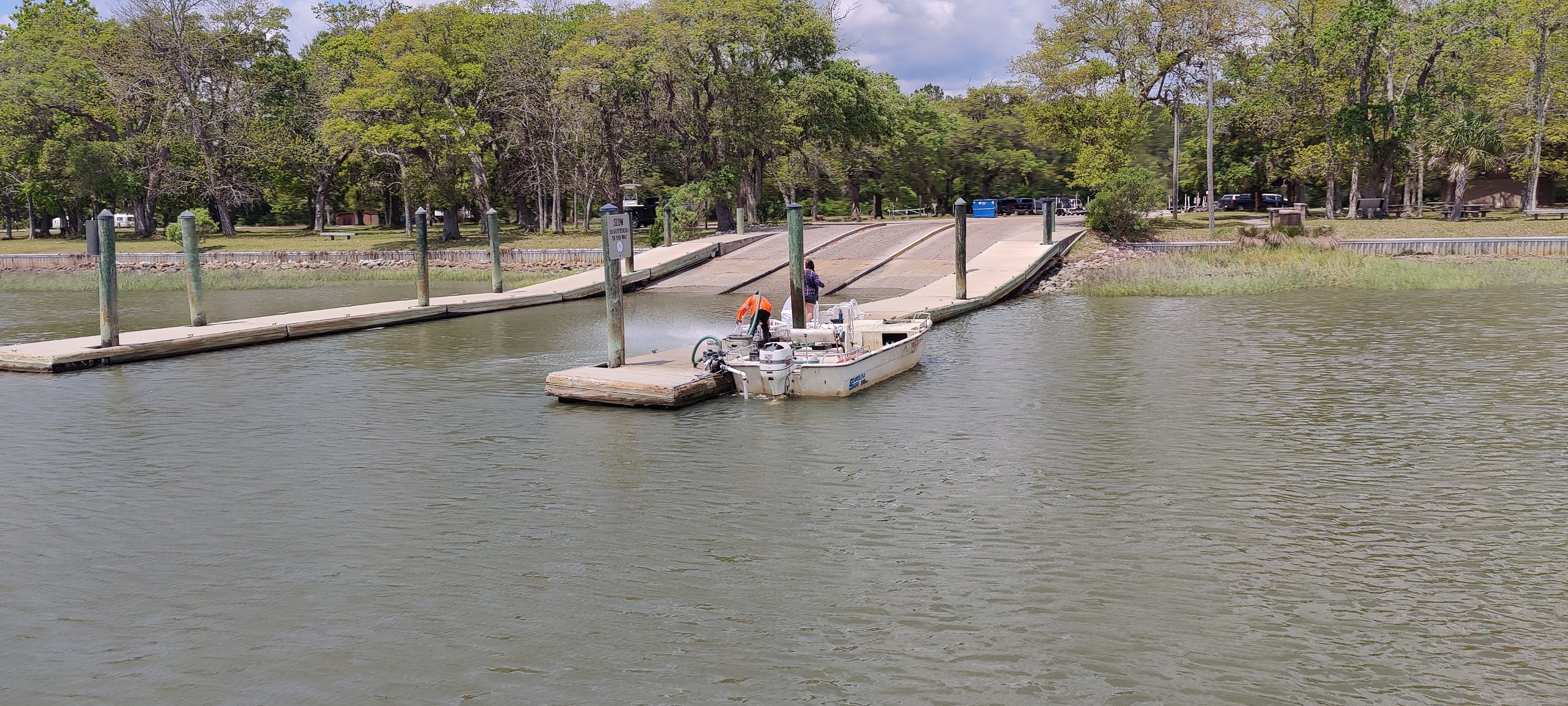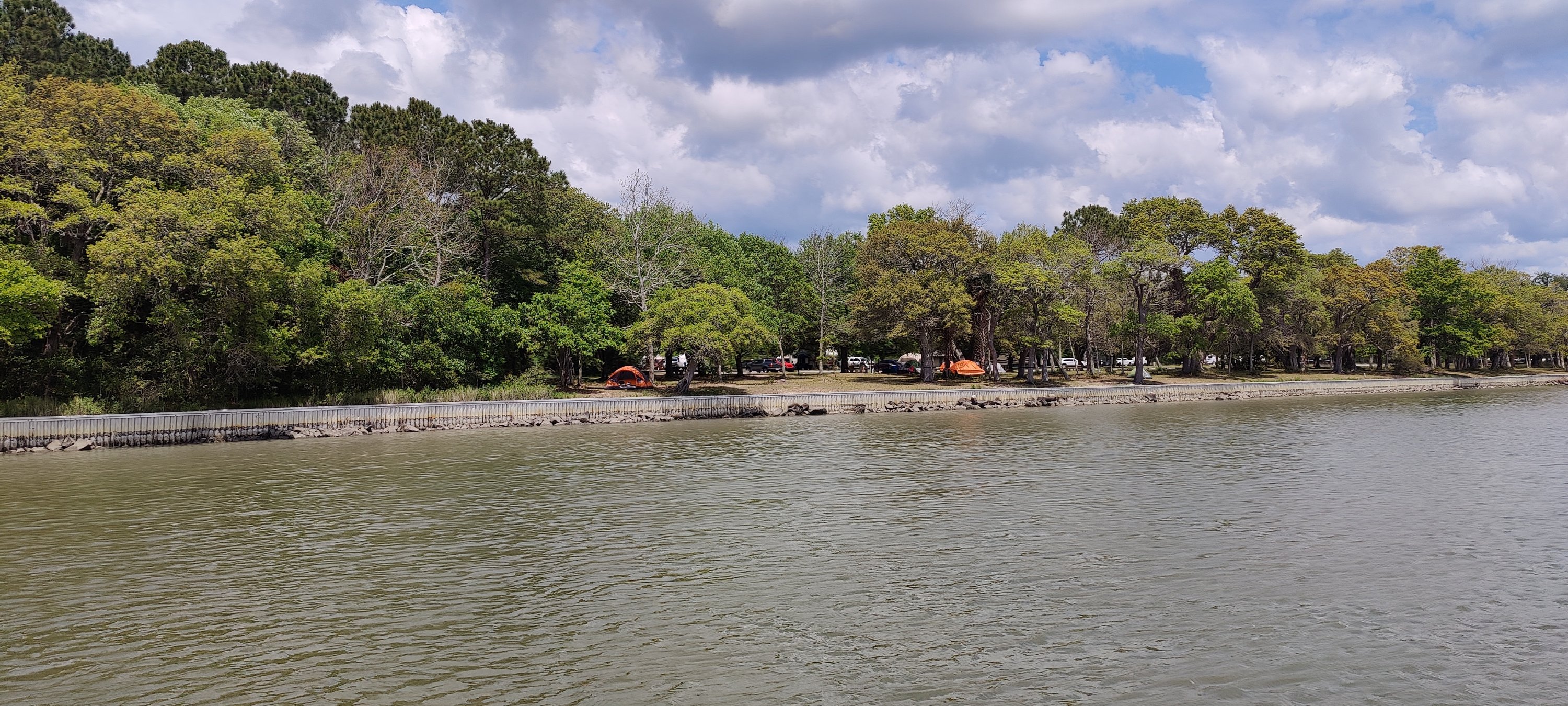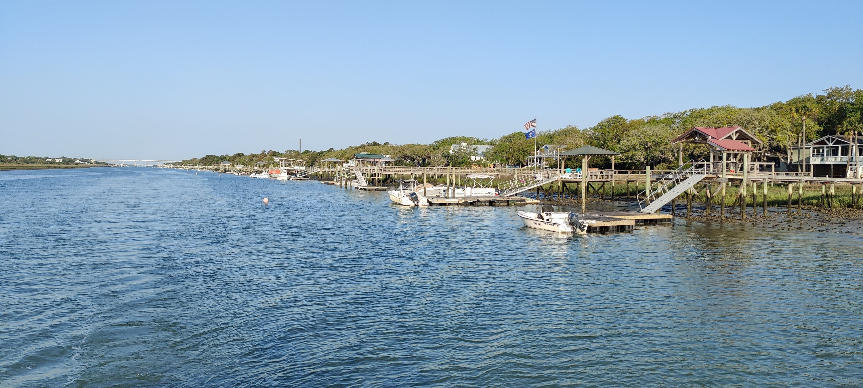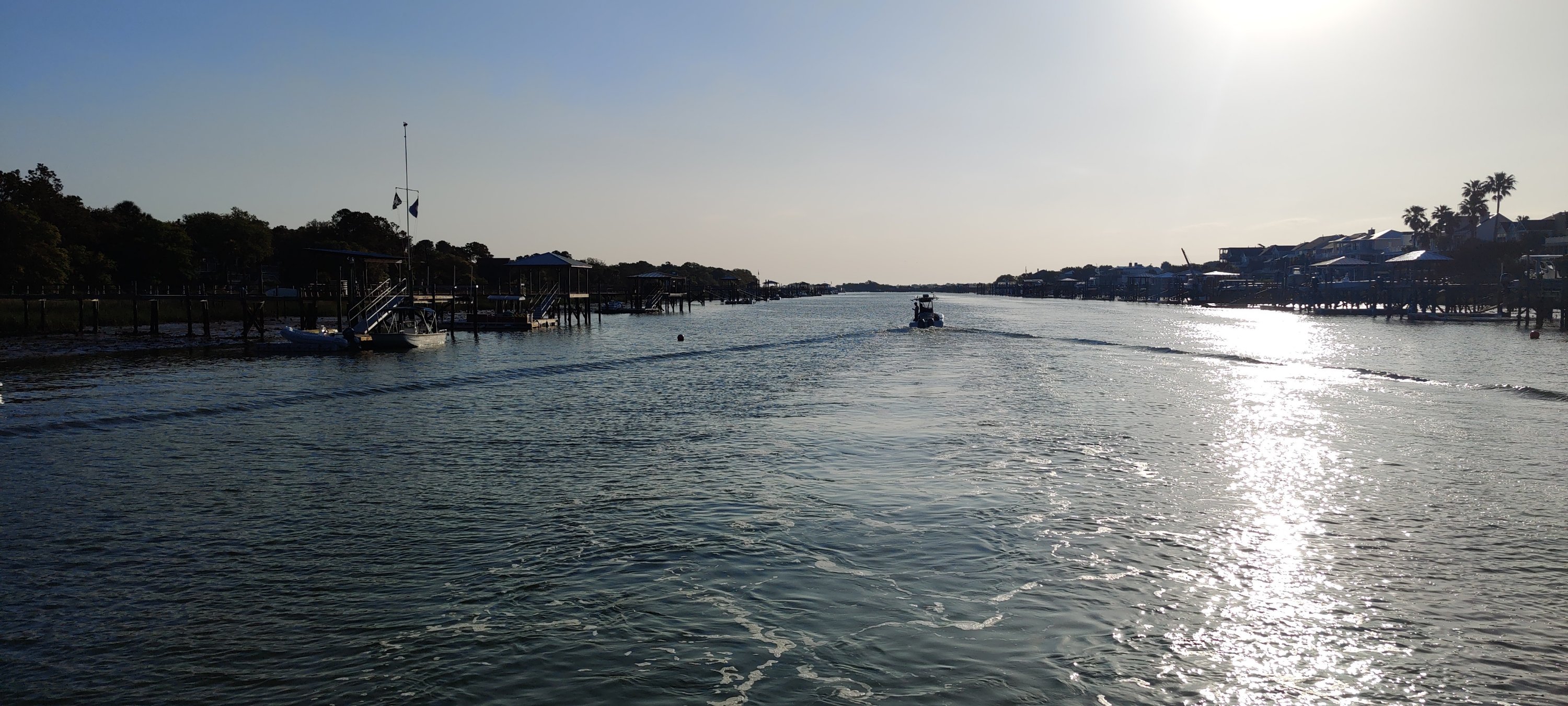 Da wir aber gemütlich fahren, ist das nur eine Art Unterbodenreinigung. Es ist eine ruhige Fahrt, vorbei an Südstaaten-Häusern mit großzügigen Stegen. Teilweise durch weitläufiges Sumpfgelände und auch an einem Campingplatz vorbei.