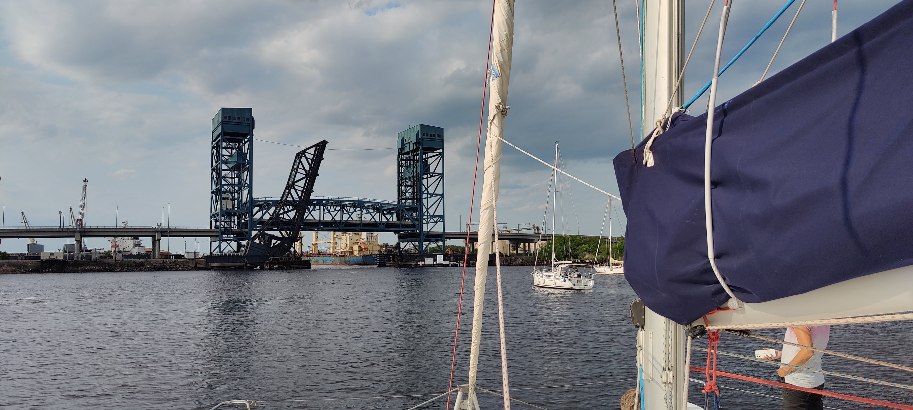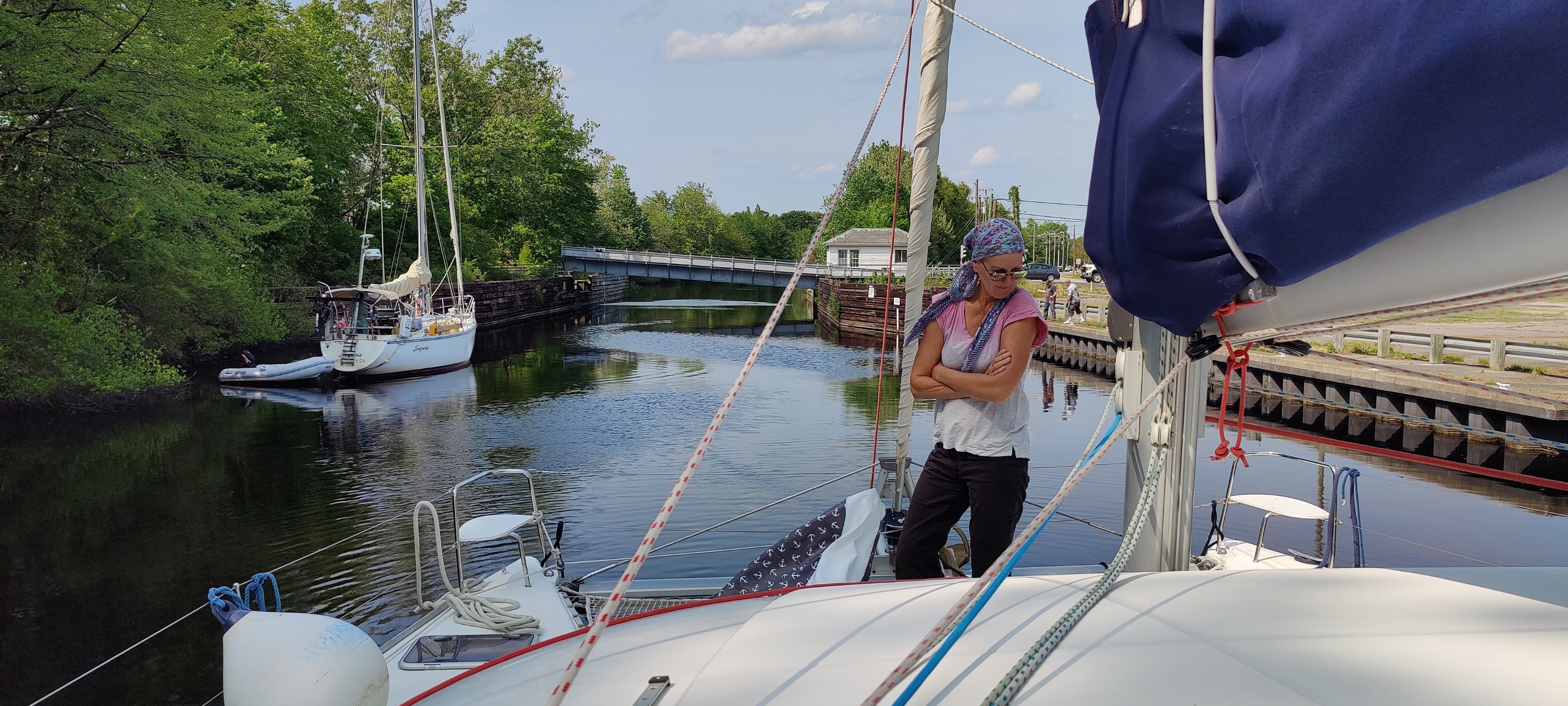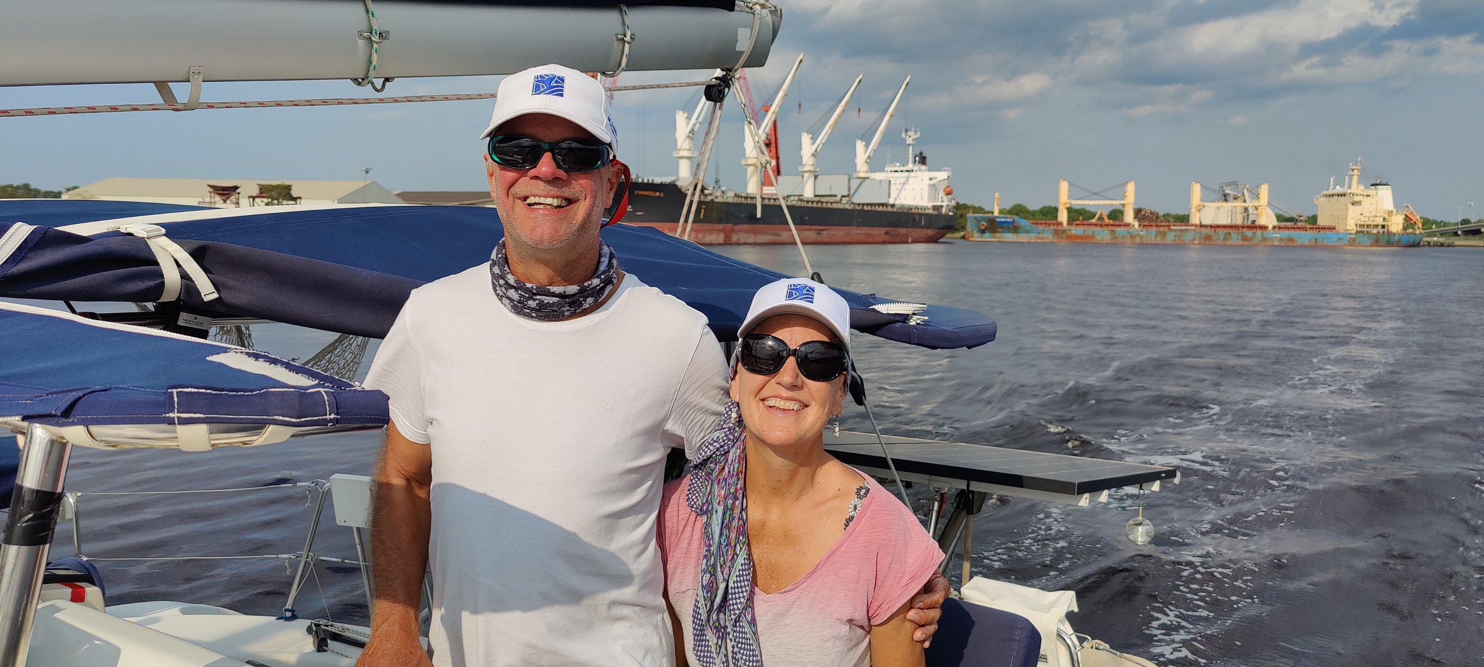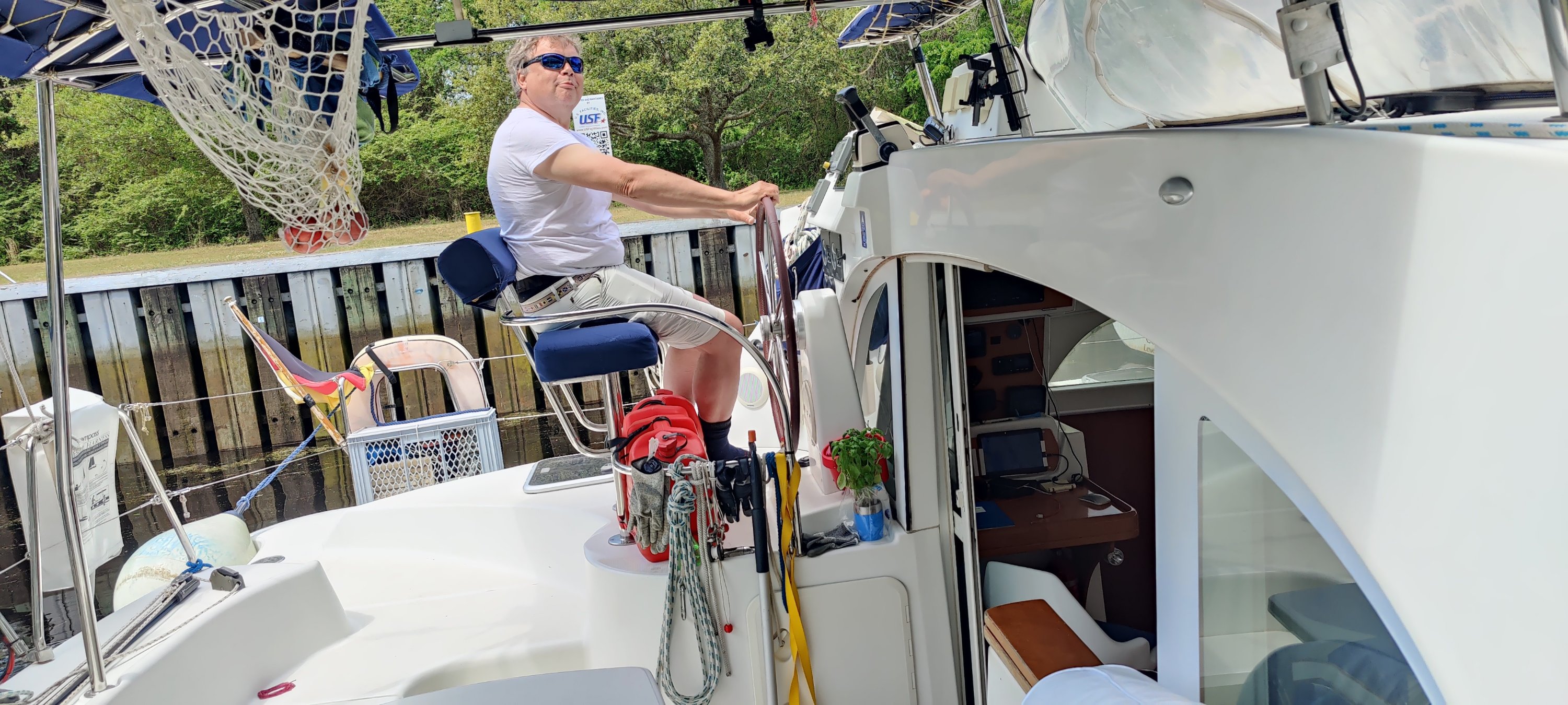 Dann erfuhren wir von der Schleusenwärterin, dass die nächste Schleuse und Brücke in einigen Meilen um 15:30 Uhr den letzten Termin für heute hat. Da uns die gute Schleusenwärterin bereits dort angemeldet hatte, flutschten wir auch da noch mit den anderen Booten durch. Glück muss man haben, sonst hätten wir erst am nächsten Morgen ab 9:00 Uhr weiter fahren können und der Zeitplan für Kees wäre knapp geworden. OK, noch einmal im Matsch stecken geblieben und dann ab in den größten Marinehafen der USA. Vorbei an Flugzeugträgern und Fregatten, die hier gewartet werden. Auch ein veritables U-Boot haben wir gesehen. Die Marina war bei unserer Ankunft bereits geschlossen, aber “freundliche” Marinabewohner wiesen uns einen Liegeplatz zu. Nun gut, wir brauchen eigentlich keine Marina, aber im Hafenbereich können wir kein eigenes Wasser machen. Also füllen wir die Tanks gut voll. Auch die Antenne wird repariert. Mit Kees an der Winsch geht das recht flott von der Hand. Nur sechsmal auf und ab. Zum Glück haben wir eine elektrische Winsch, die mich hoch zieht. Und schon stand der Abschied von Kees an. Er fliegt zu Verwandten nach NewYork und dann heim. Das waren zwei sehr schöne Wochen und wir konnten von dem reichen Erfahrungsschatz von Kees einiges mitnehmen. Danke dafür!!!👍