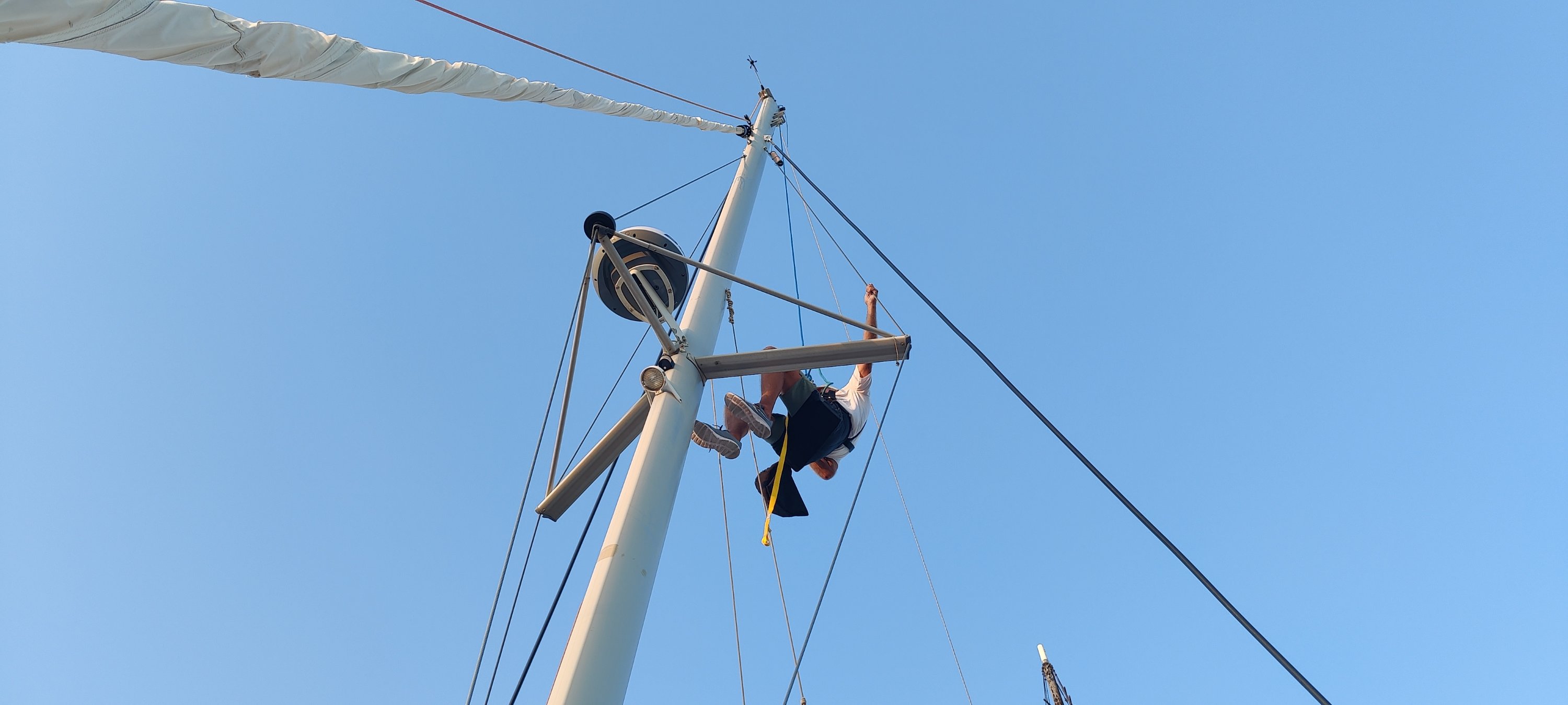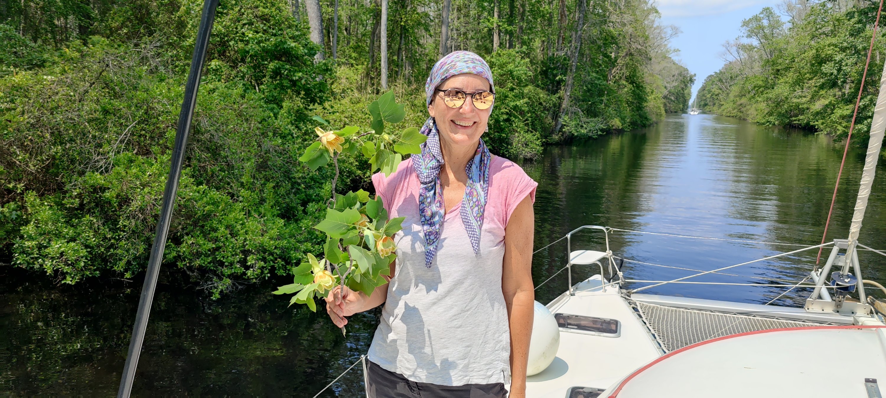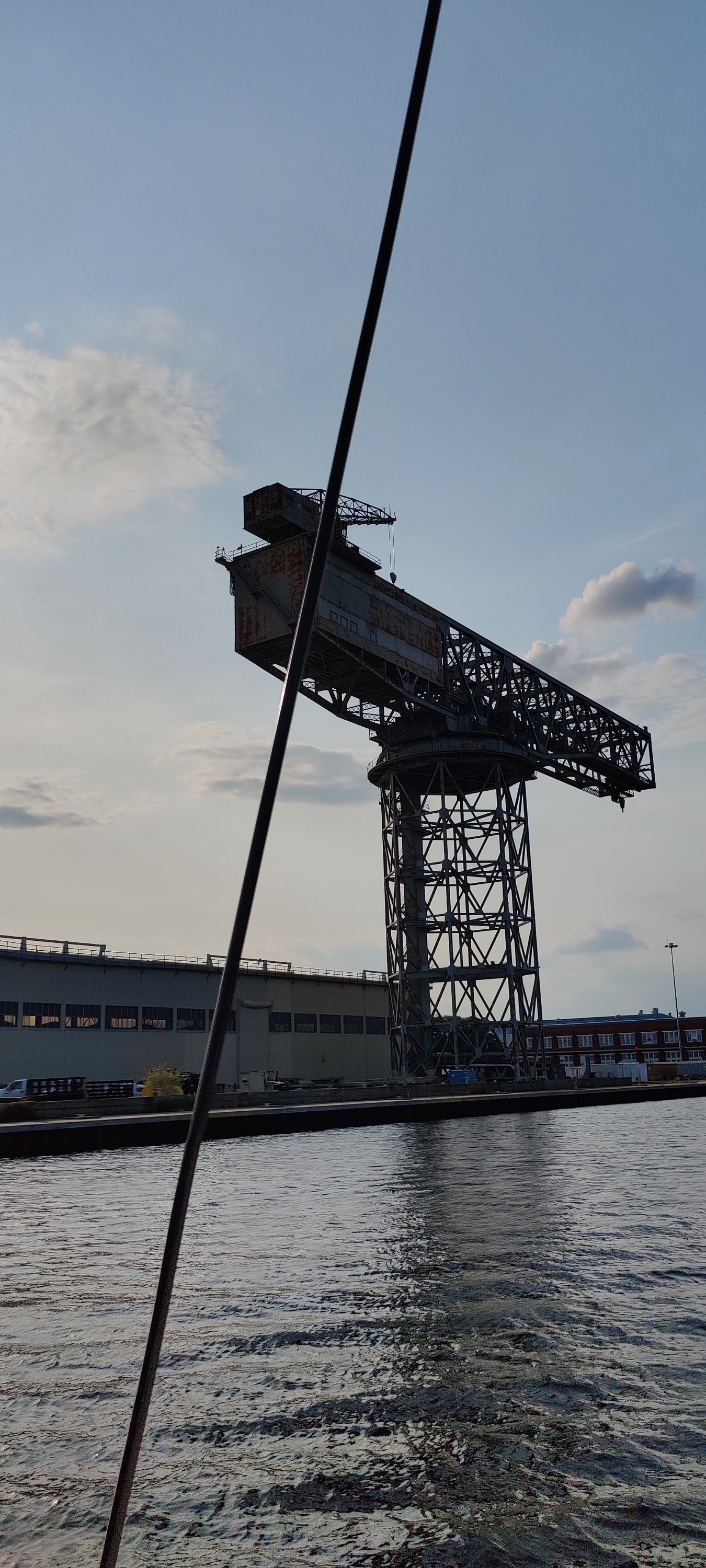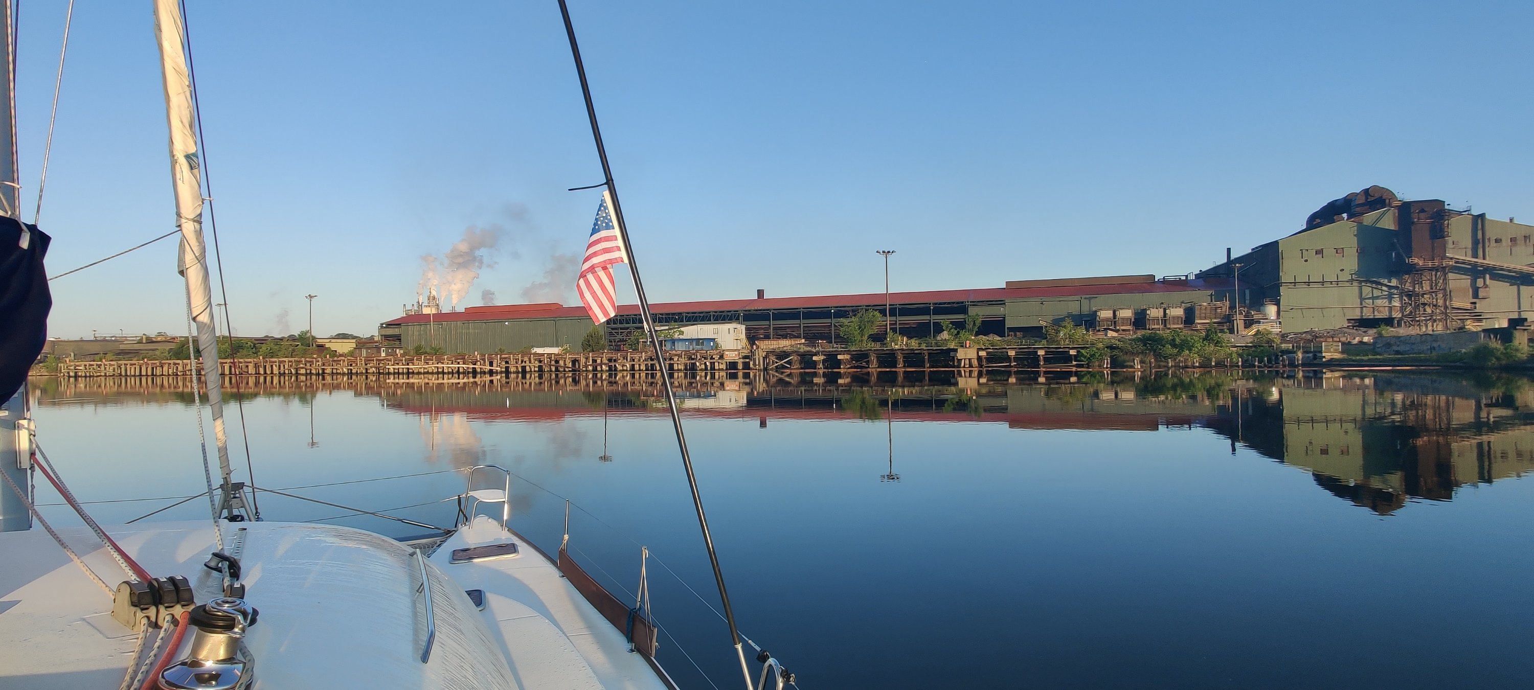 Dann erfuhren wir von der Schleusenwärterin, dass die nächste Schleuse und Brücke in einigen Meilen um 15:30 Uhr den letzten Termin für heute hat. Da uns die gute Schleusenwärterin bereits dort angemeldet hatte, flutschten wir auch da noch mit den anderen Booten durch. Glück muss man haben, sonst hätten wir erst am nächsten Morgen ab 9:00 Uhr weiter fahren können und der Zeitplan für Kees wäre knapp geworden. OK, noch einmal im Matsch stecken geblieben und dann ab in den größten Marinehafen der USA. Vorbei an Flugzeugträgern und Fregatten, die hier gewartet werden. Auch ein veritables U-Boot haben wir gesehen. Die Marina war bei unserer Ankunft bereits geschlossen, aber “freundliche” Marinabewohner wiesen uns einen Liegeplatz zu. Nun gut, wir brauchen eigentlich keine Marina, aber im Hafenbereich können wir kein eigenes Wasser machen. Also füllen wir die Tanks gut voll. Auch die Antenne wird repariert. Mit Kees an der Winsch geht das recht flott von der Hand. Nur sechsmal auf und ab. Zum Glück haben wir eine elektrische Winsch, die mich hoch zieht. Und schon stand der Abschied von Kees an. Er fliegt zu Verwandten nach NewYork und dann heim. Das waren zwei sehr schöne Wochen und wir konnten von dem reichen Erfahrungsschatz von Kees einiges mitnehmen. Danke dafür!!!👍