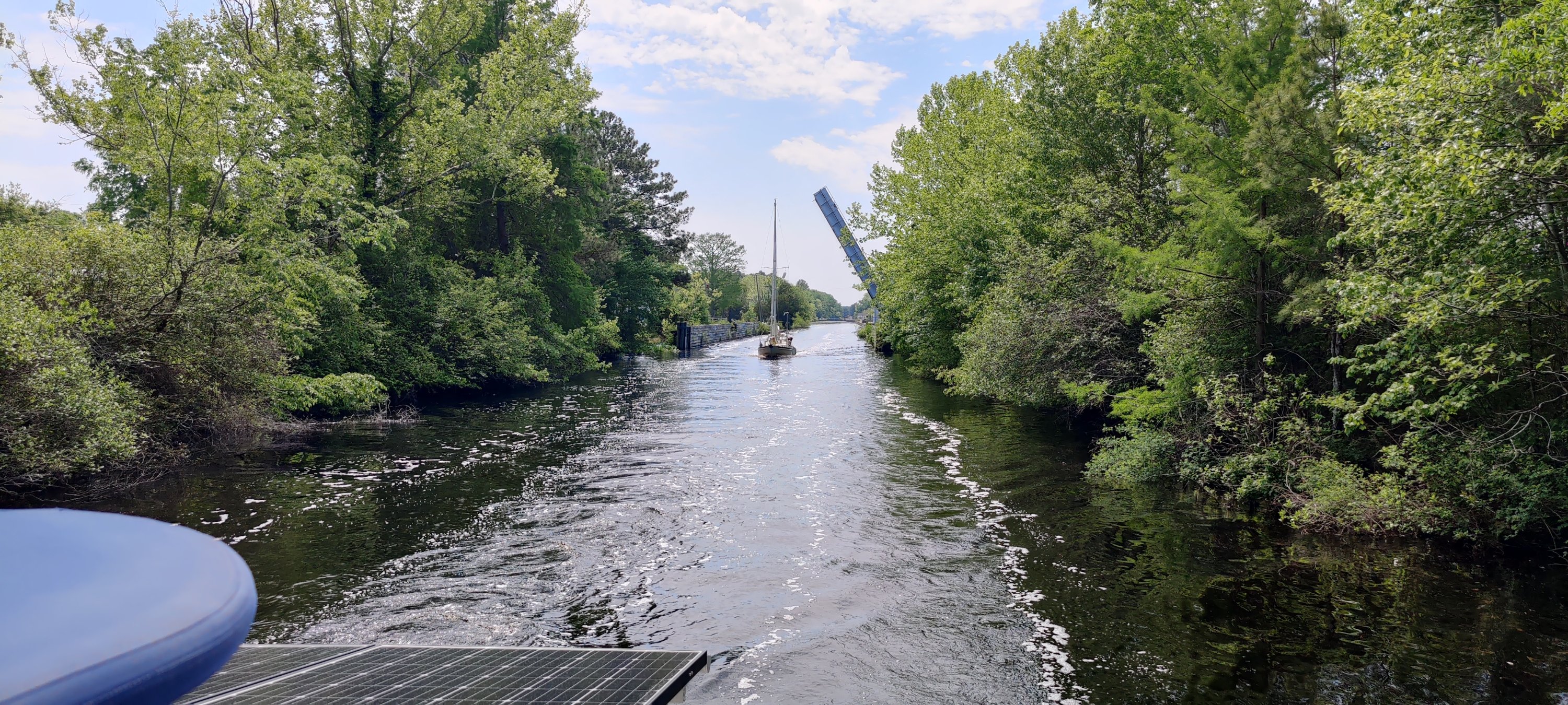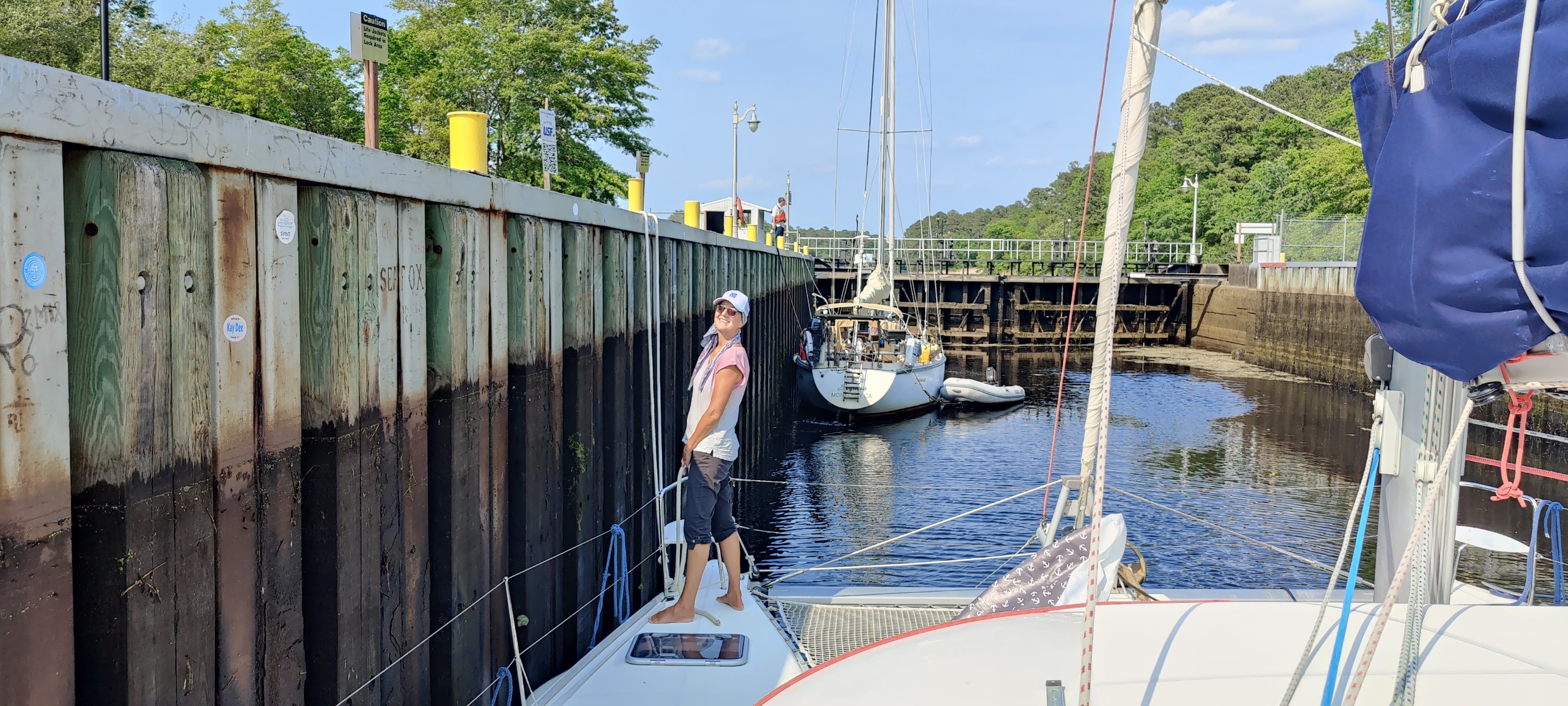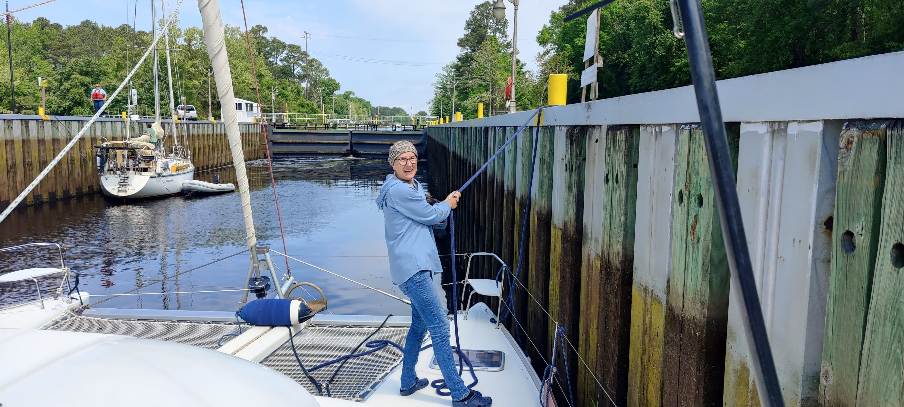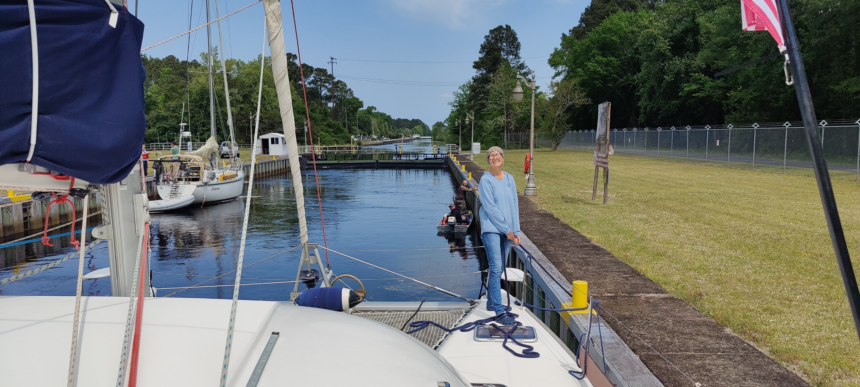 Als wir nach der morgendlichen Abfahrt aus Elizabeth City an die nächste Schleuse kamen, erfuhren wir: 11:00 Uhr letzte Schleusung und wir hatten um 10:55 Uhr noch 2 Meilen Fahrt vor uns. Über Funk haben wir um späten Einlass gebeten, durften als letztes Schiff noch mit rein. Glück gehabt!