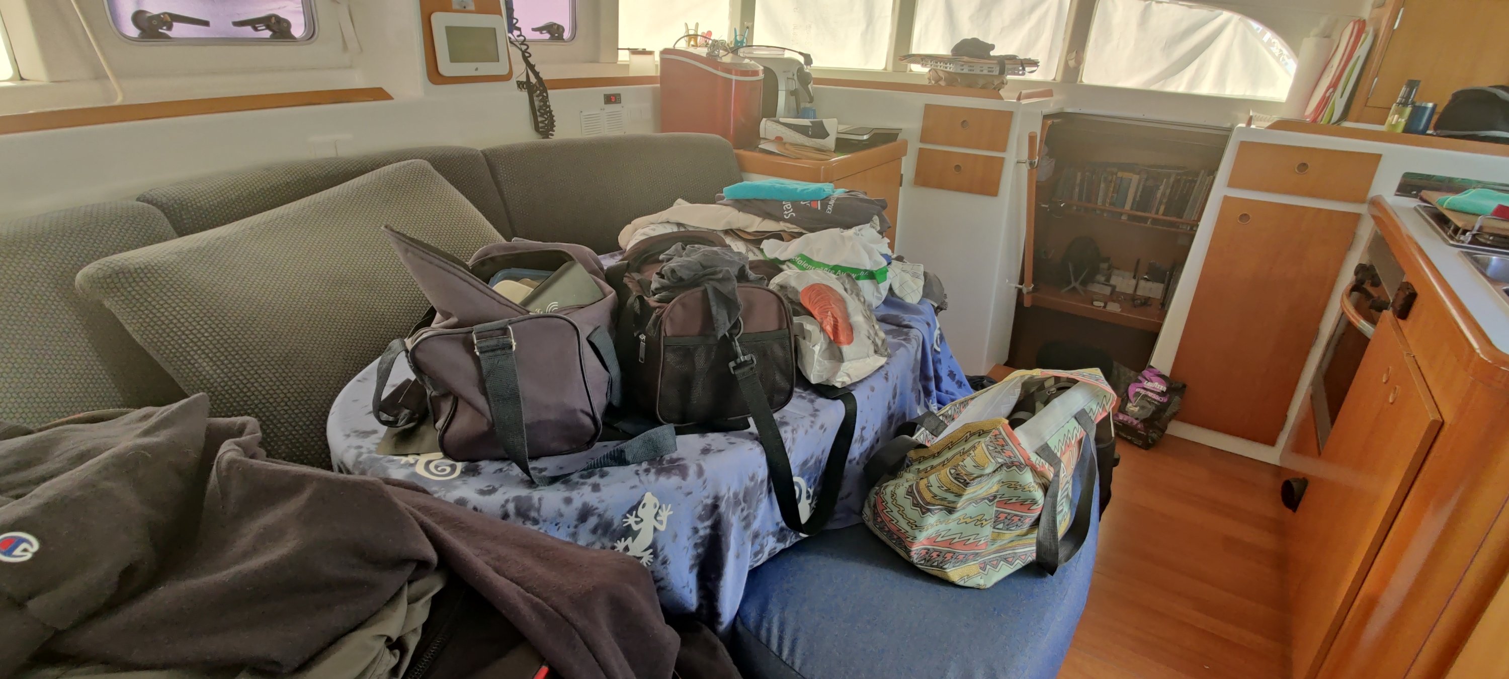 So, bei uns steht jetzt Arbeit an. Das Unterwasserschiff braucht eine Auffrischung, unser neues Vorsegel aus Hongkong ist angekommen und wartet auf Erprobung und 92 kg Material wollen verstaut werden …