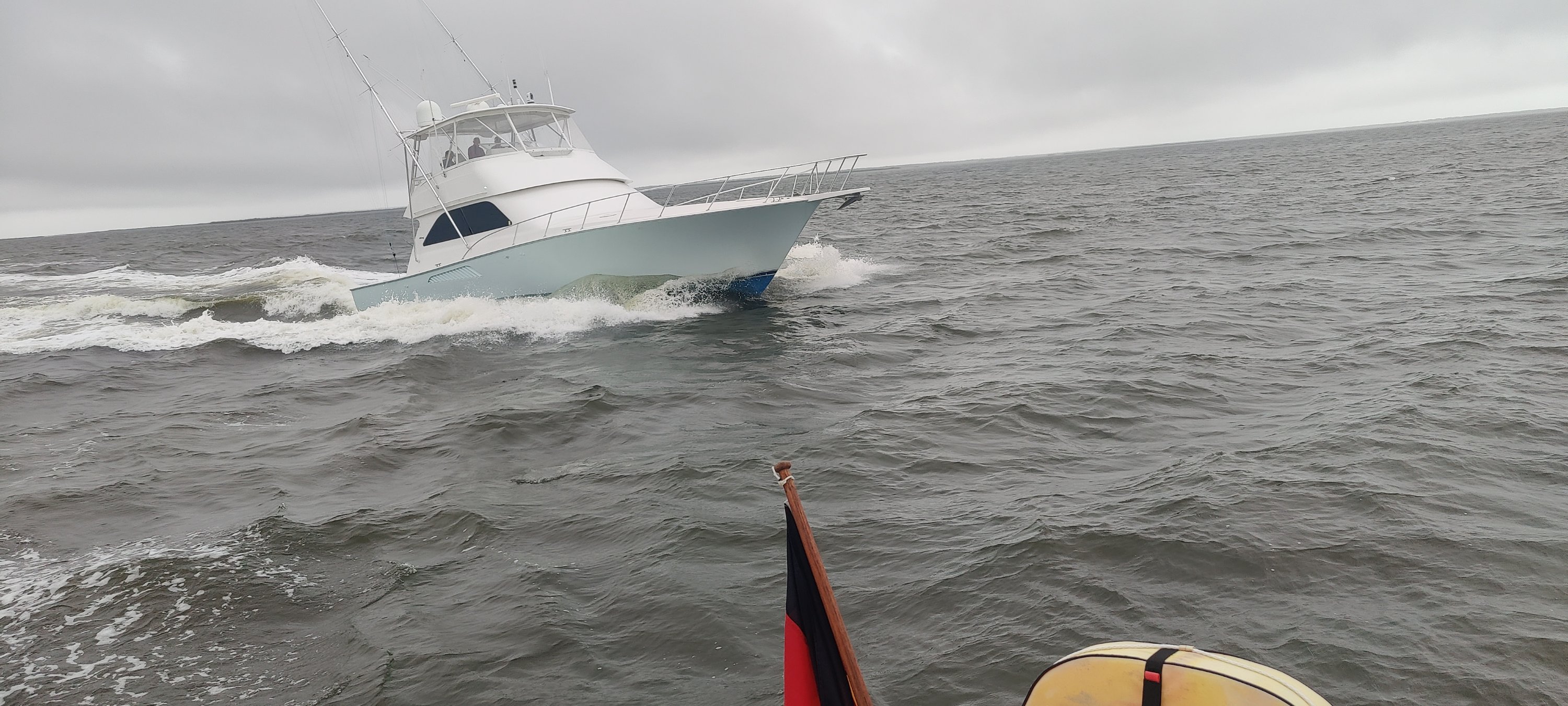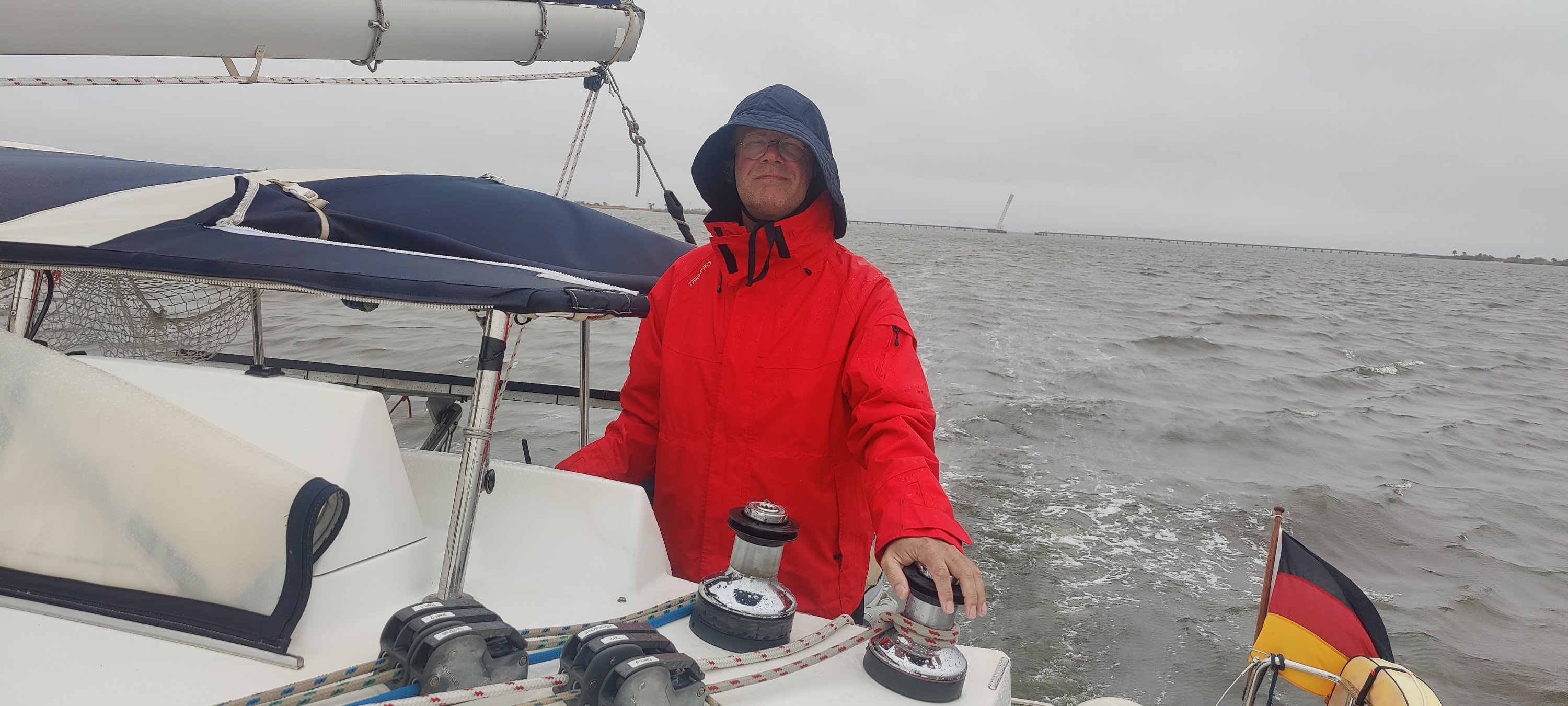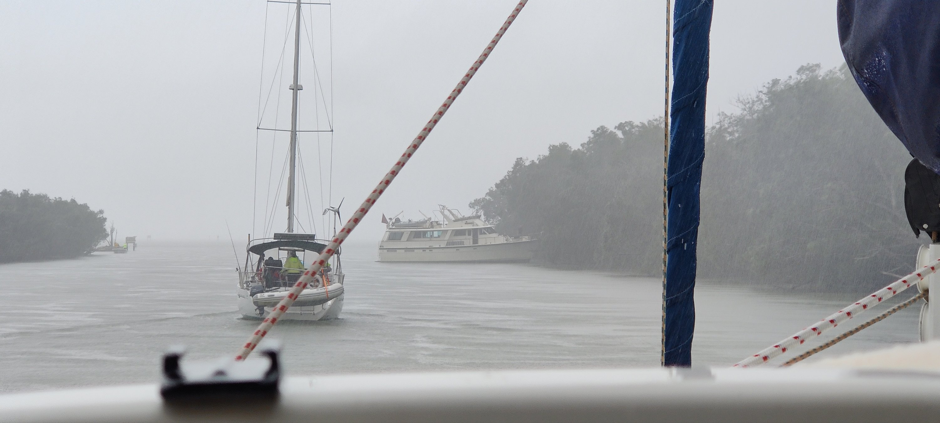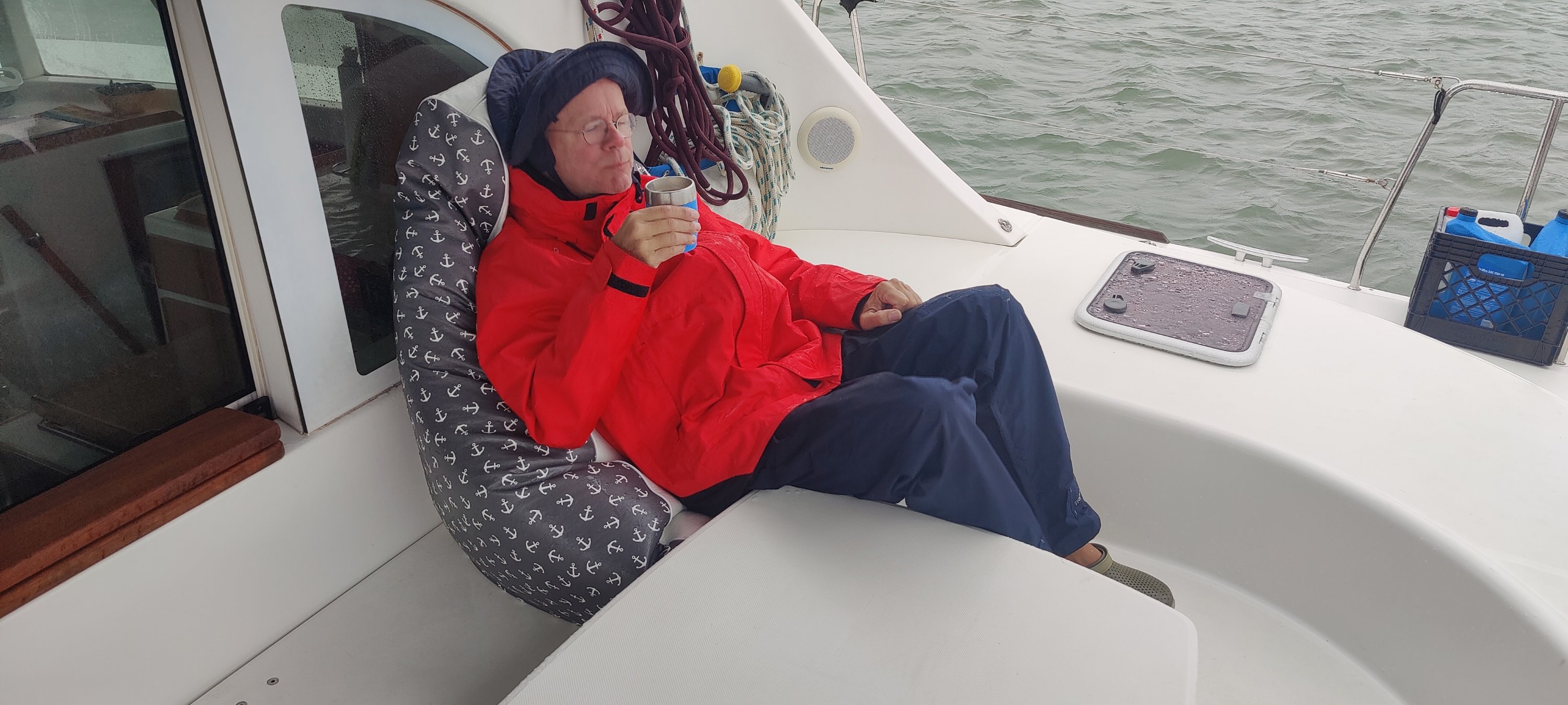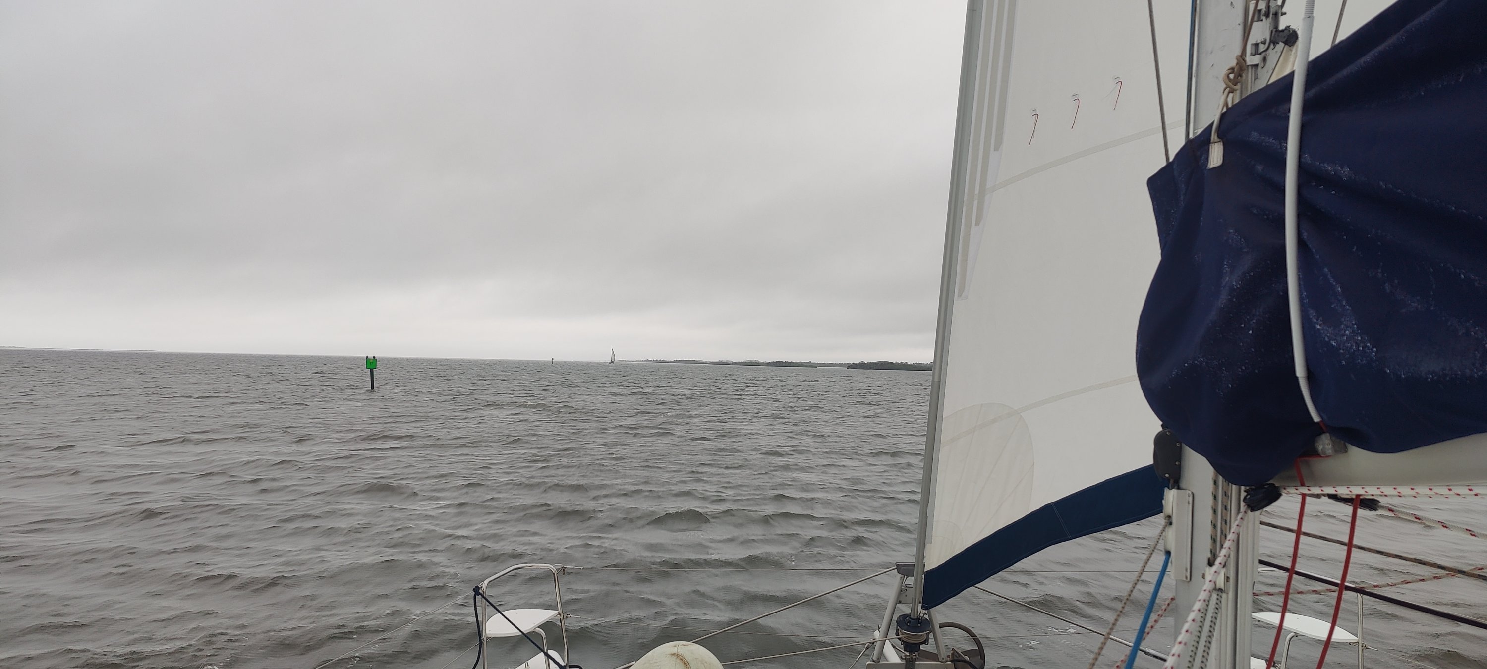 Der zweite Tag war dann übel. Es goss aus Kübeln, aber wir hatten ja ein Ziel! Also zum ersten Mal seit der Atlantiküberquerung die Segeljacke und den Südwesterhut aktiviert.