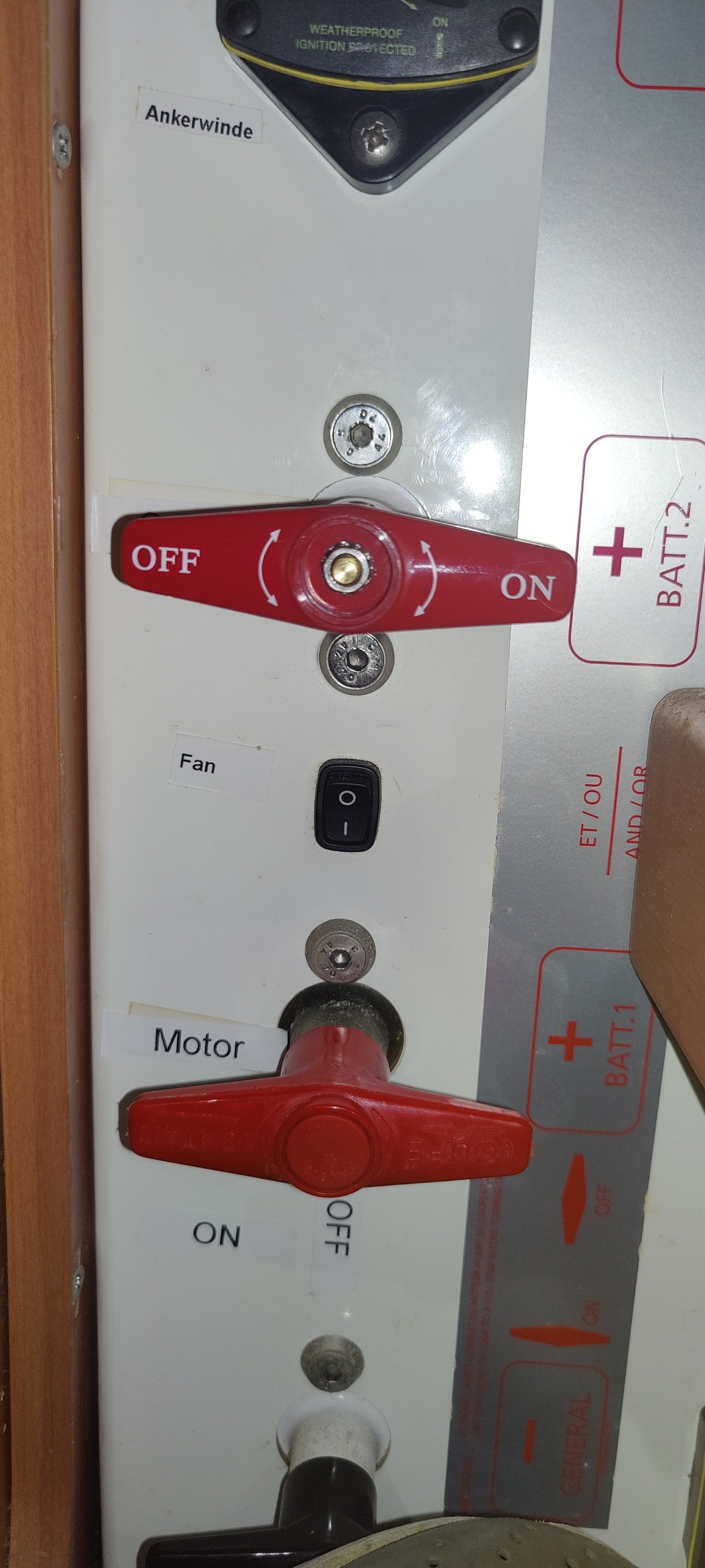 Hinter einer Abdeckkappe befindet sich eine Schraube mit Mutter. Die hatte sich gelöst. Damit konnte man zwar noch den Knebel umlegen, elektrisch hat sich aber nix getan, der Schalter blieb an! Doof und gefährlich! Wenn ein Schalter ausgestellt ist, muss das auch bedeuten, dass der Stromkreis offen ist, also kein Saft mehr im System ist. Nun gut, Gefahr erkannt, Gefahr gebannt. Und für die Zukunft mit einer Kontermutter gesichert.