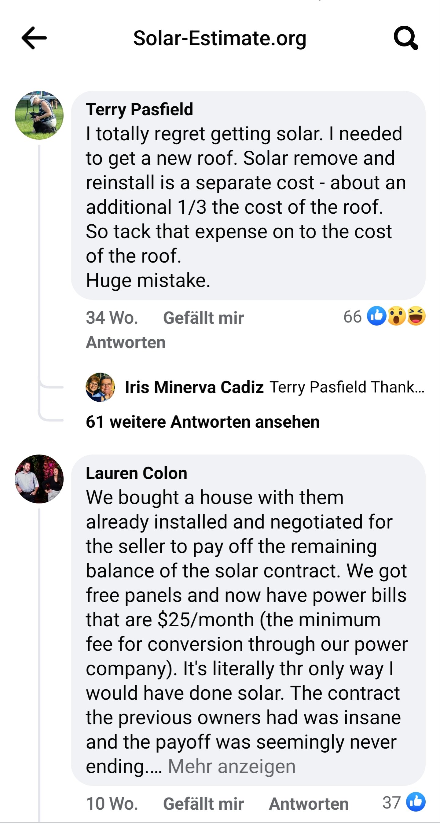 Die überwiegende Mehrzahl der Kommentare ist negativ zu Solar. Offensichtlich spielen hier die Energieversorger ein übles Spiel. Ihnen geht ja potenziell viel Geld verloren. Und Amortisationen von 5 bis 10 Jahren überfordern den finanziellen und geistigen Horizont vieler Bürger hier.