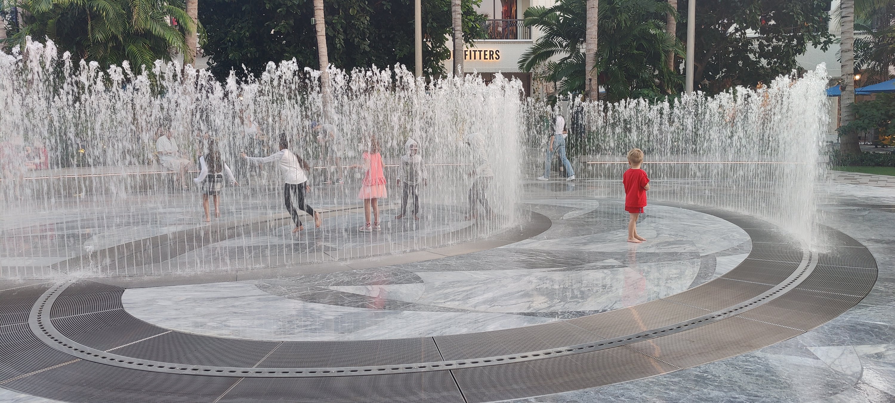 In Downtown sorgt die Stadt für ihre Einwohner und Touristen. Am Sonntag waren wir mal wieder bei unserer Amazon Abholstation. Sie liegt an einem kleinen Zentrum ( The Square) mit Geschäften, Kino und Restaurant. In der Mitte gibt es eine Grünanlage (Kunstrasen) mit Liegestühlen, Tischen und einem Springbrunnen, der für Spaß bei Kindern und Eltern sorgt.