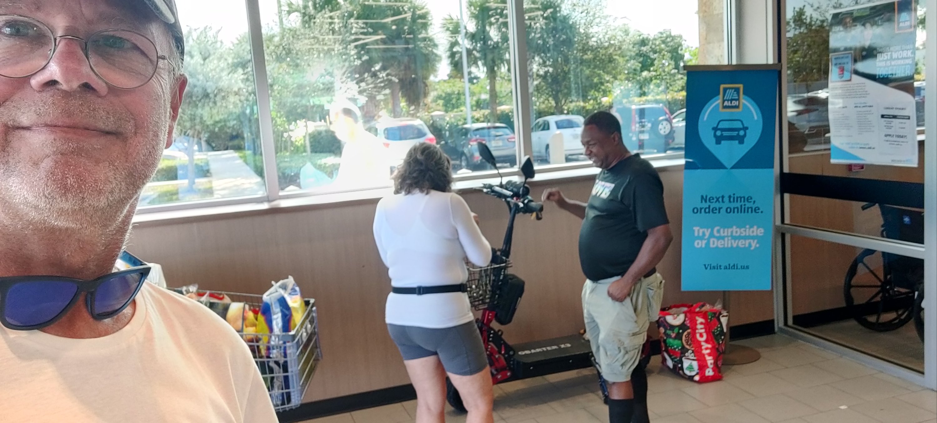 Was uns immer wieder hier in den USA fasziniert, ist die Mentalität der Menschen. Unglaublich offen, solange es keine spezielle Themen sind: Ich hatte den geilen Scooter im Eingang gesehen. 50 km/h Spitze. Der nette “schlanke” Herr erklärte mir das Teil begeistert. Es gesellte sich die Dame interessiert dazu und schon hatten wir ein munteres Gespräch über die Möglichkeiten und Vorteile der elektrischen Mobilität. Die ist hier, im Gegensatz zu Deutschland, ohne Beschränkungen. Das ist einfach klasse und funktioniert. Fazit des Gespräches: Für den kürzeren innerstädtischen Verkehr einfach klasse!