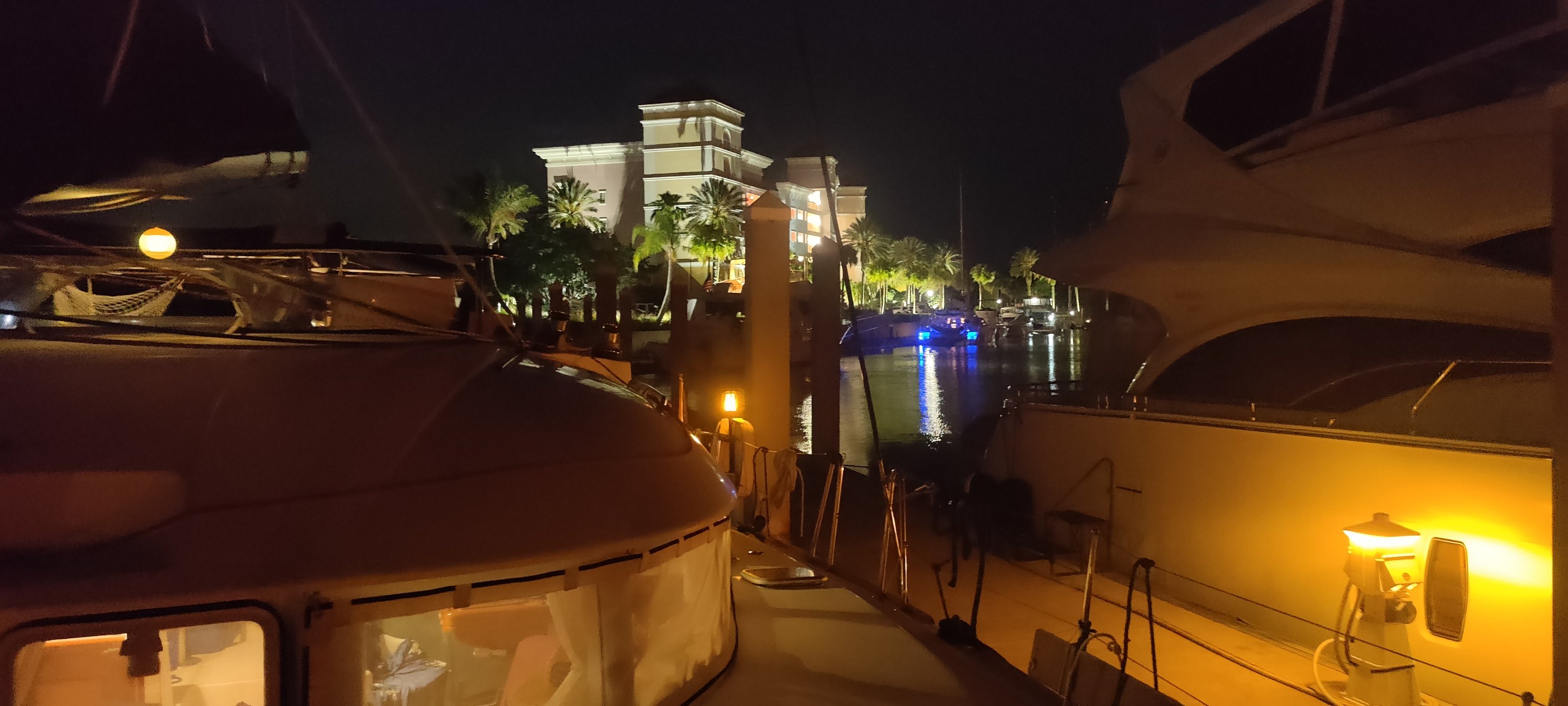 Die weitere Fahrt war ohne große Besonderheiten. Wir sind immer in aller Frühe losgefahren und dann nach 10 bis 12 Stunden zur Nacht vor Anker gegangen. Einmal war es dann schon wirklich dunkel und das enge Fahrwasser bot keinen Ankerplatz. Aber, unverhofft kommt oft, da erscheint eine Marina mit einem großen Steg direkt am ICW. Dort lag eine große Segelyacht. Der Skipper meinte, festmachen über Nacht bei frühen Start am nächsten Morgen wäre in Ordnung. Er half uns beim Festmachen und ein nettes Gespräch bei einem guten Getränk rundete den Tag ab.