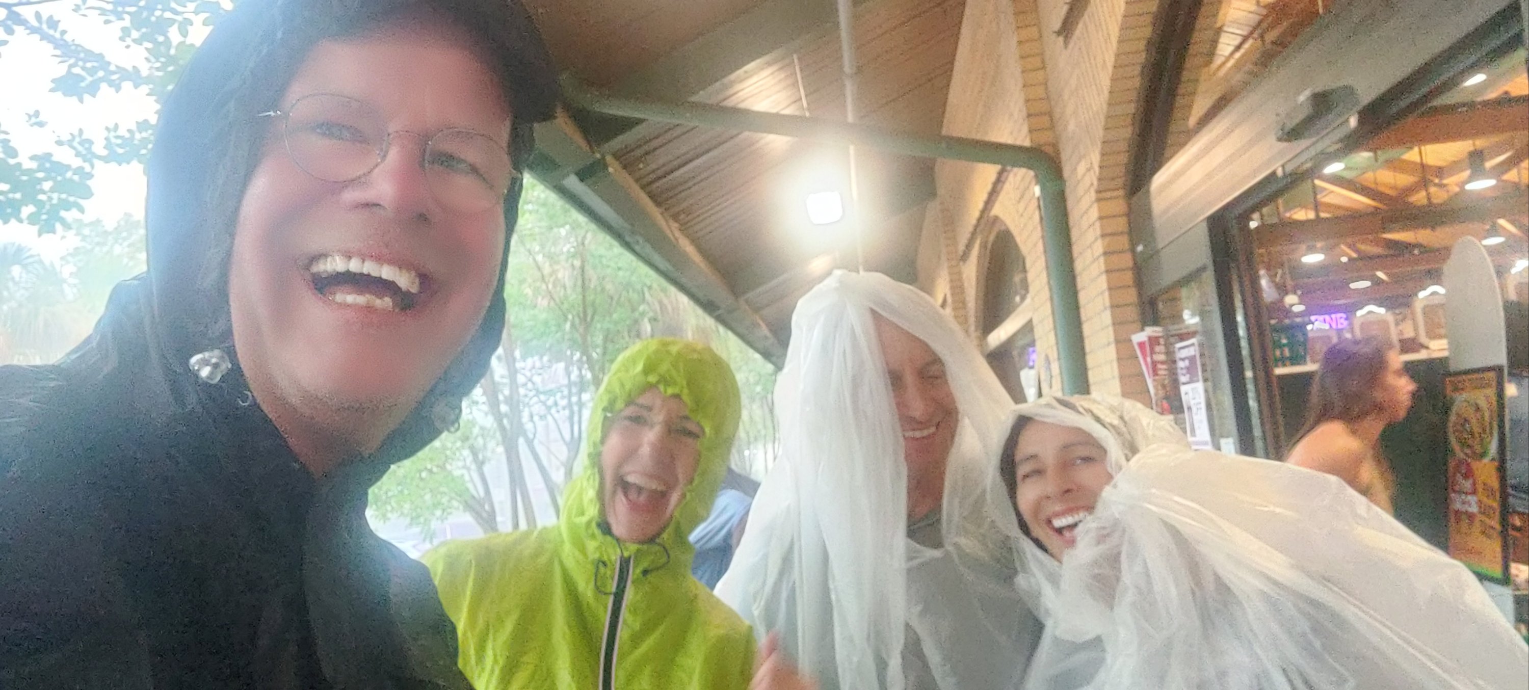 Solch eine Regenmenge hatten wir noch nicht erlebt. Wir wurden davon beim Marsch zum Restaurant überrascht. Die netten Damen vom Supermarkt gaben Coe und Noel zwei Müllsäcke. Damit konnten sie dann, nachdem das Schlimmste vorbei war, halbwegs geschützt wieder zur Marina zurück gehen. Mehr war heute nicht drin.