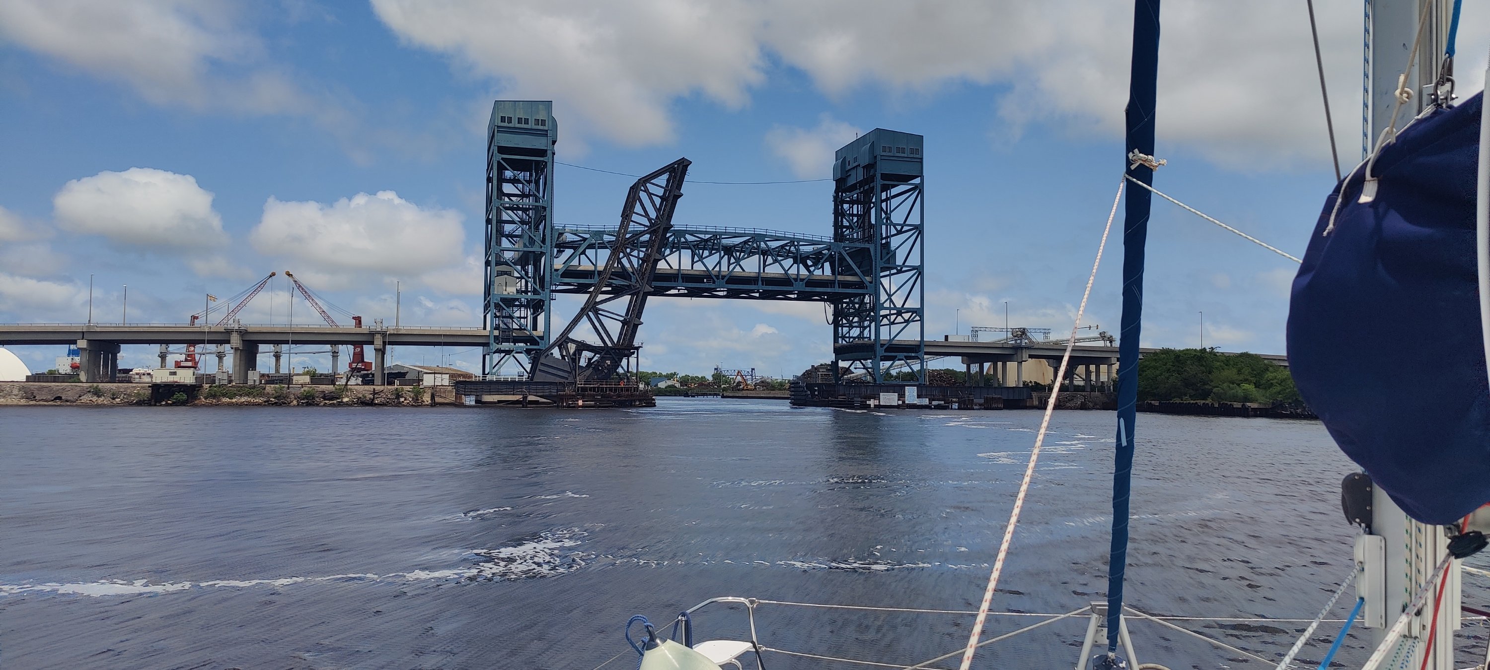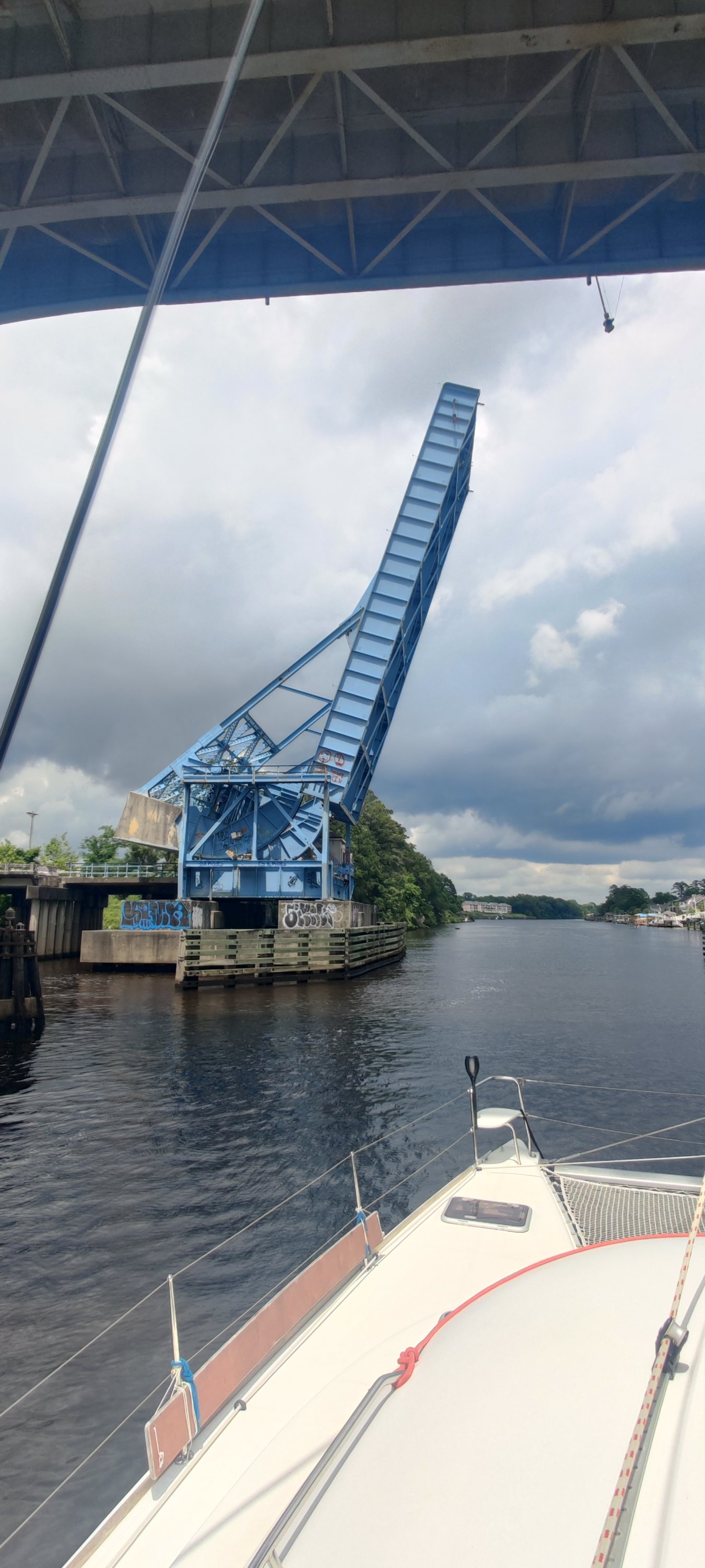 Die Northerly Bridge besteht aus einer Highway Brücke und direkt davor einer Eisenbahn Brücke. Wir kommen von Norden an und sehen eine Anzahl Boote und große Hafenschlepper warten. Es rollt ein elend langer Güterzug über die Brücke. Die Highway Brücke ist offen, der Highway ist für Autos gesperrt, wohl wegen Sanierung. Der Zug ist durch, nix passiert. Der Kapitän eines Schleppers fragt höflich nach, wann denn die Brücke in etwa aufgehen würde. “In a short time” kommt nach mehrmaligem Fragen als Antwort. Ca 15 Minuten später, die Eisenbahnbrücke schwenkt hoch, aber die Highwaybrücke fährt runter. Was soll denn das??? Lunchzeit! Ein Baufahrzeug stand vor der Brücke und fährt jetzt zum Essen fassen los 😂😂😂. Ja und nun, fragt der Kapitän des Schleppers, wann es denn weiter geht. Antwort siehe oben. Nach ca. einer weiteren Viertelstunde geht die Highwaybrücke hoch und alle Boote können nach Norfolk weiter fahren.