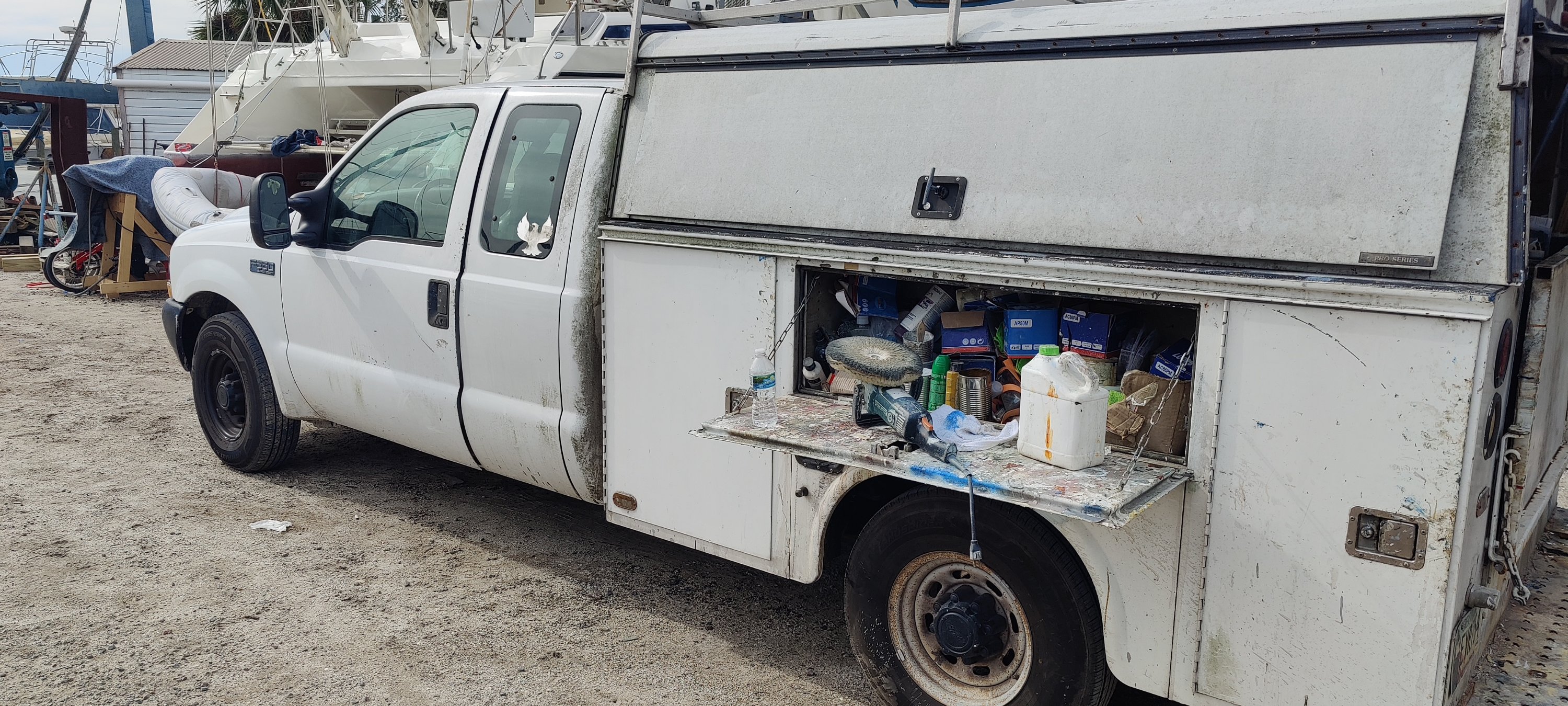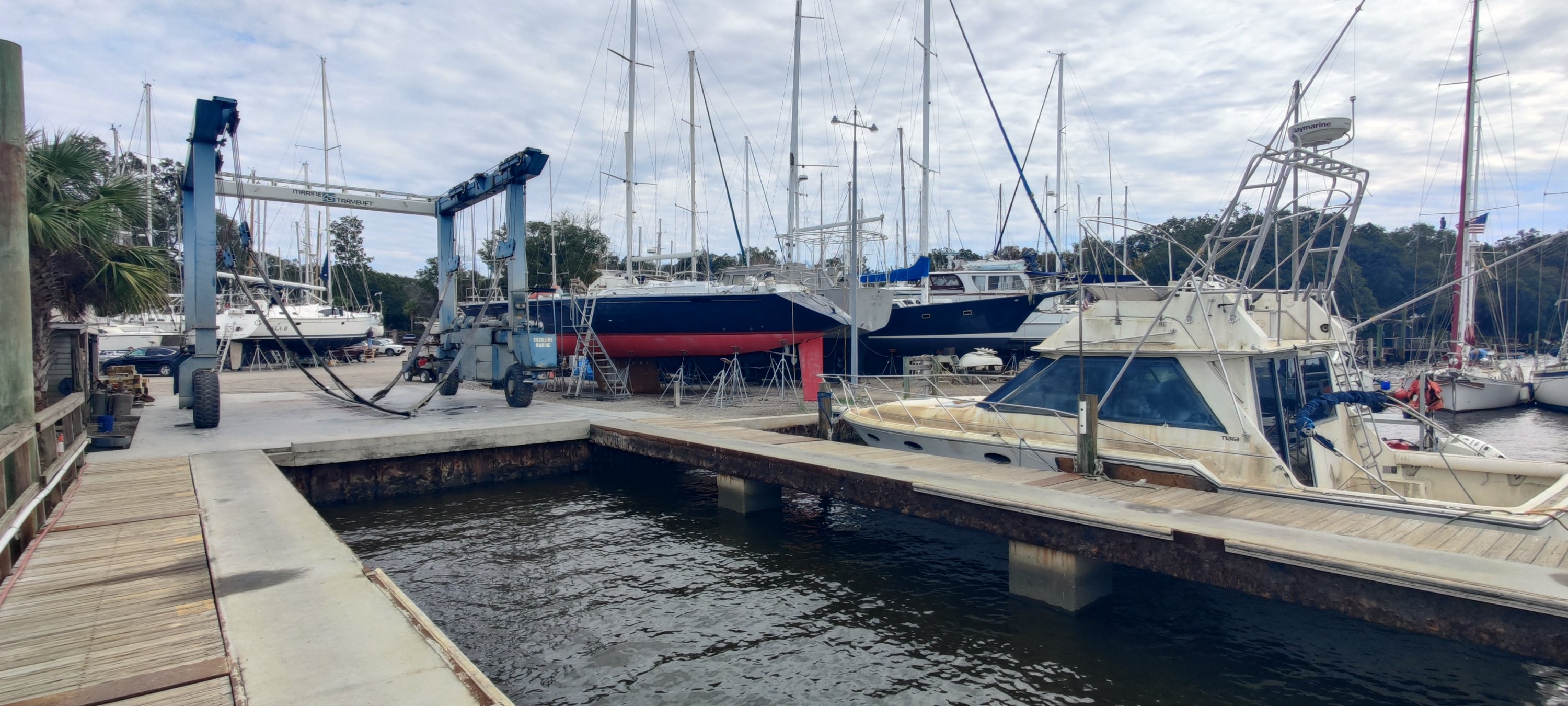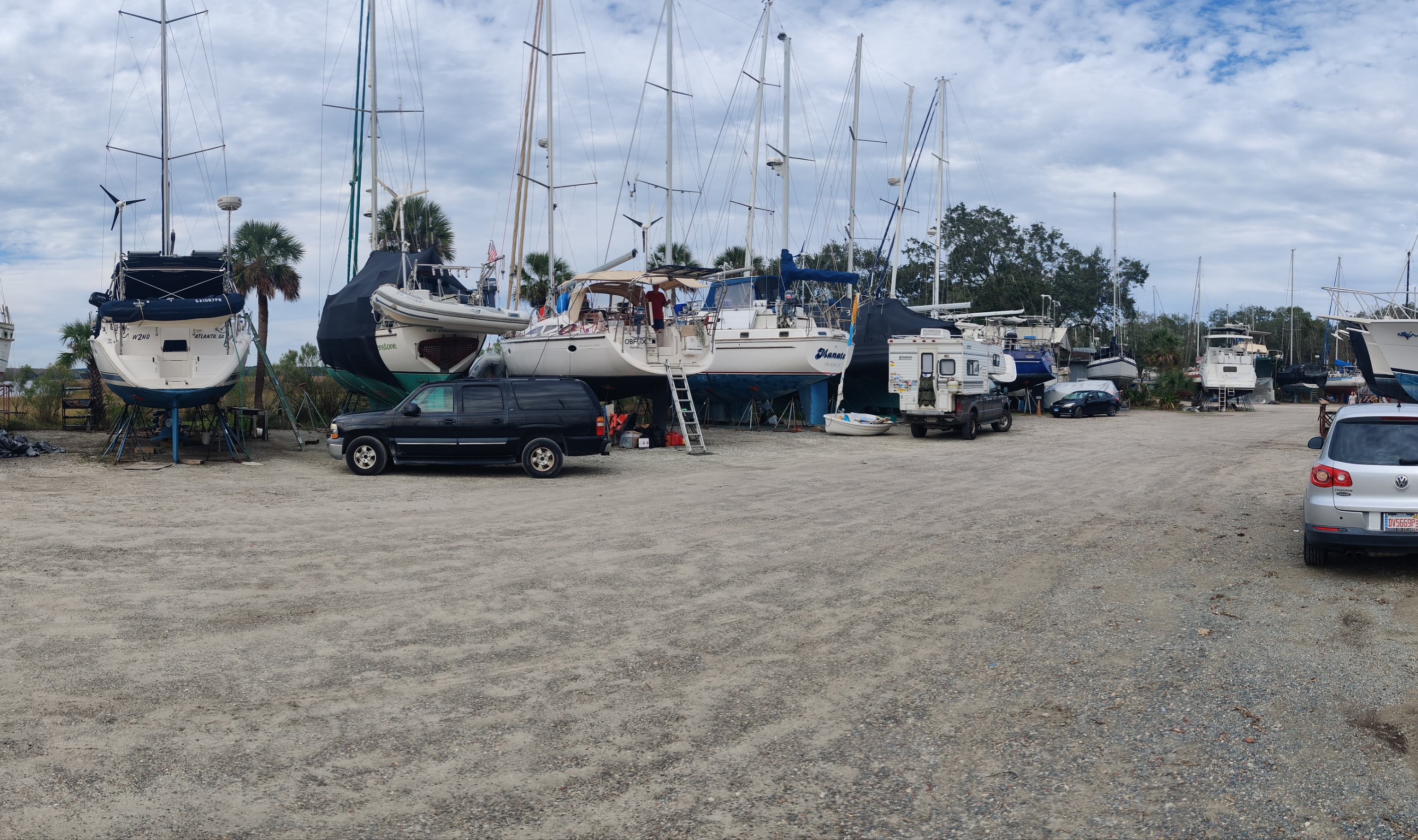 Wir sind in der Nähe von St. Marys gelandet. Wenige 100 m nördlich von Florida. Hier gibt es neben der Marine-Basis für die Atom-U-Boote auch eine “Marina”. Diese ist etwas speziell, erfüllt sie doch die Bedürfnisse einer speziellen Klientel. Keine Dusche, kein WC, kein Sozialraum, keine schicke Steganlage, kein Restaurant, keine Tankstelle. Lediglich ein paar Dixi-Toiletten findet man verstreut über den Boatyard. Aber einen Werkraum mit Kreissäge, Ständerbohrmaschine und jeglichem anderem Gedöns gibt es. Auch gibt es neben der Drechselbank für Holz eine Drehbank für Metallarbeiten!👍 Eine bunte Mischung aus Kränen, Liften und Transportern macht die Sache rund.