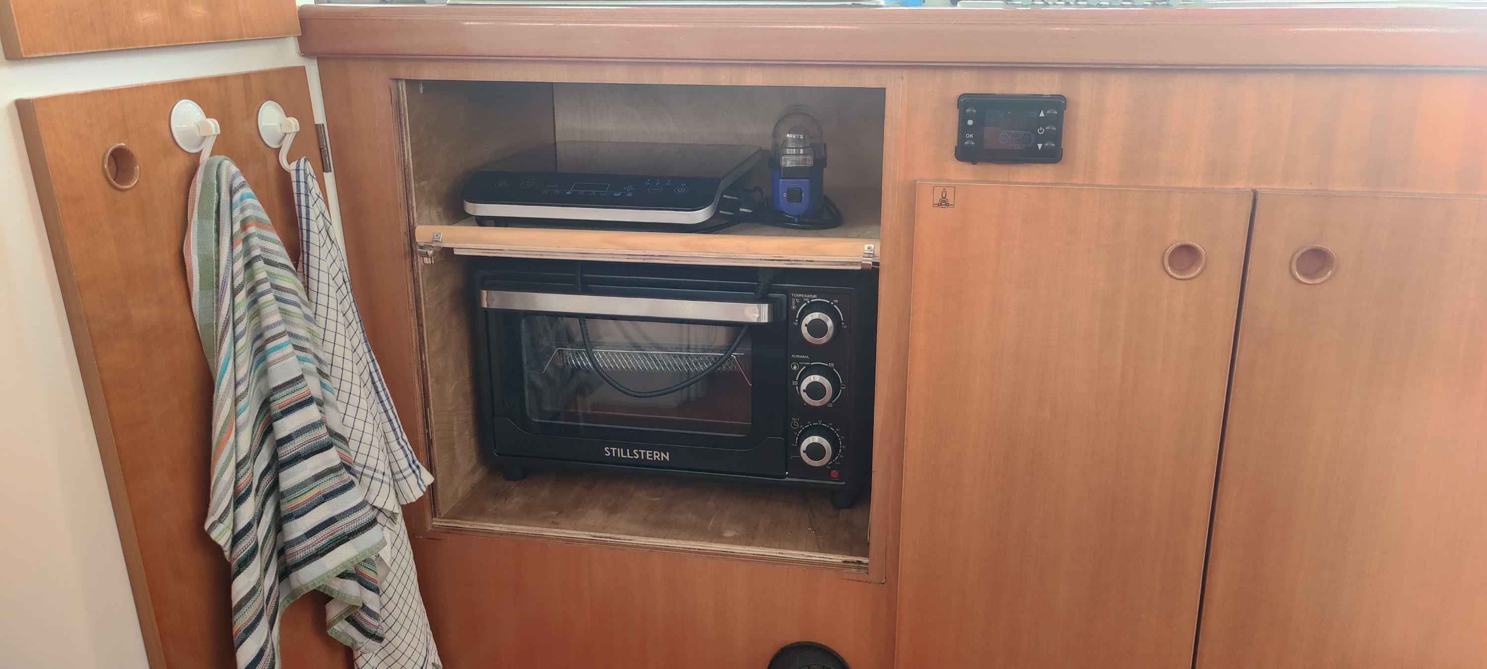 Ja, die Kreissäge auf dem Boatyard war sehr nützlich. Dort wo bisher der nie benutzte Gasbackofen in der Küche eingebaut war, ist jetzt ein Regal für einen elektrischen Backofen und die Induktionsplatte. Etwas Kosmetik steht noch an, aber das Prinzip funktioniert schon mal. 👍