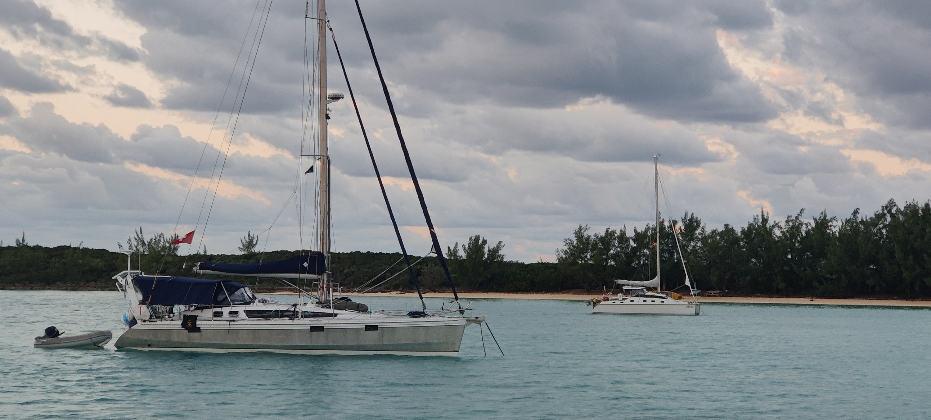 Zusammen mit etwas Motorunterstützung geht es flott voran. Trotzdem kommen wir in dunkelster Nacht, der Mond geht gerade erst auf, in Manjacks Cay an. Gut, wir kennen die Bucht, so ist das gut machbar. Aber unbeleuchtete Ankerlieger erfordern die ganze Aufmerksamkeit. Anker runter, ein kleines Bier und die erste Nacht vor Anker in den Bahamas🌴👍⛵⚓🌈