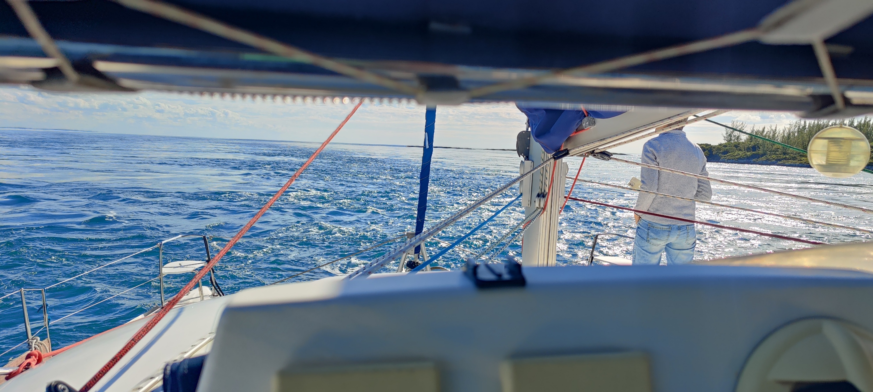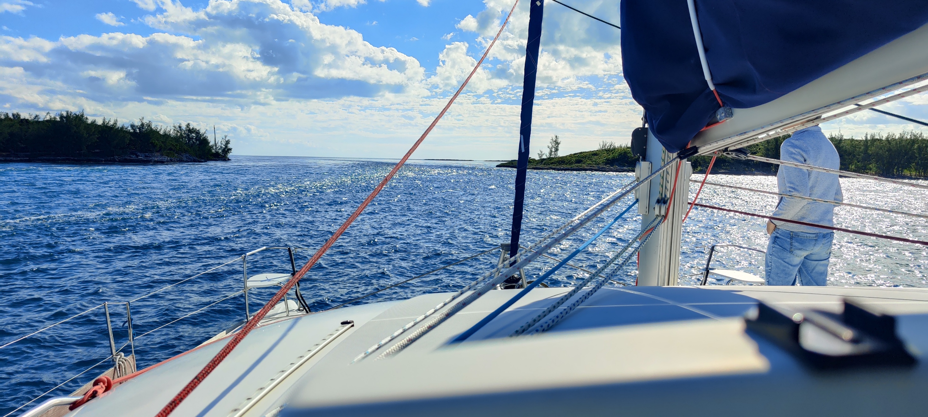 Das gurgelnde Wasser erfasst uns, aber wir haben immer gut Druck am Ruder und können sauber durchfahren. Dahinter ist das Wasser total ruhig. Keine Welle trübt das Bild. Die Wolken machen ein einzigartiges Lichtspiel in  den Farben der Bahamas.