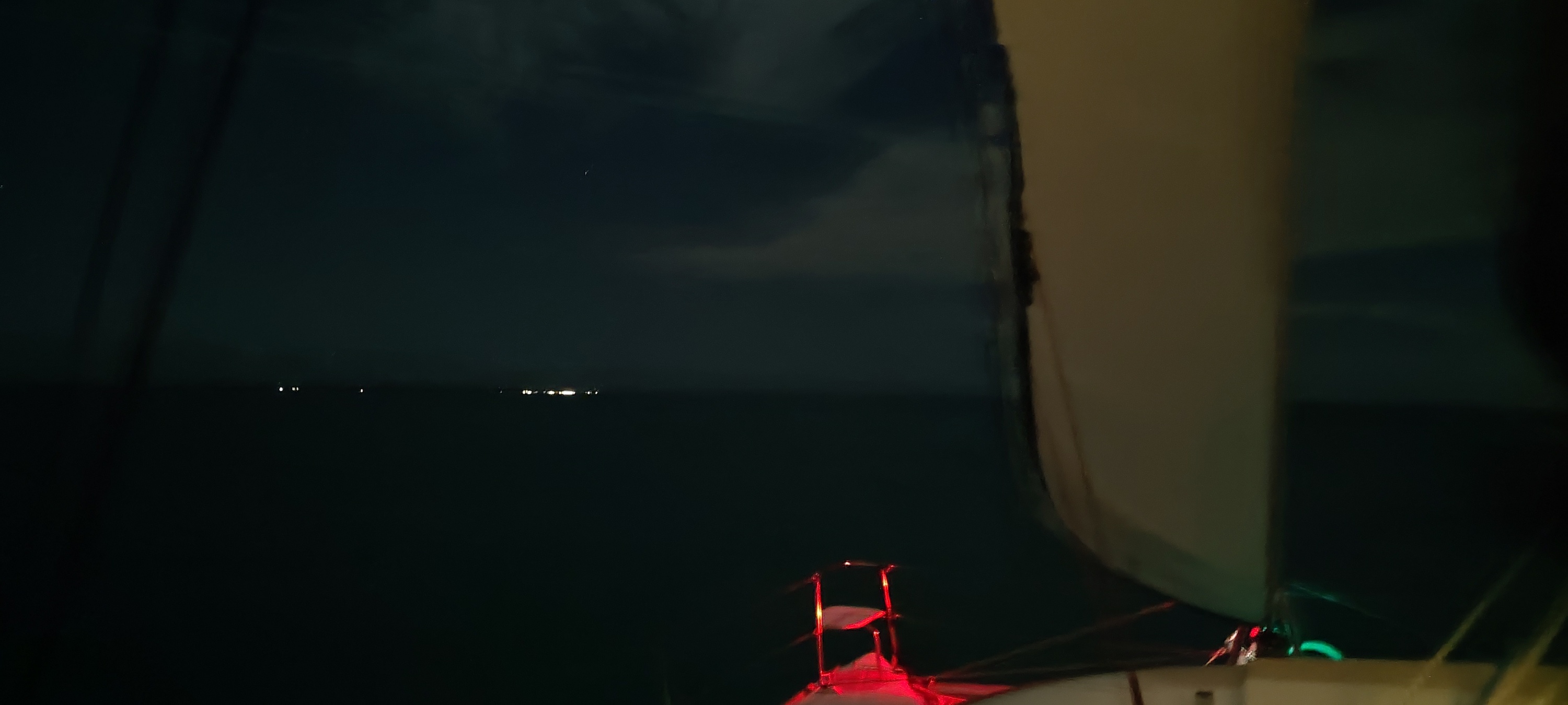 Cherie steht mit der starken Taschenlampe vorne am Bug und passt auf, dass wir kein unbeleuchtetes Boot rammen. Die Discokugel blitzt. Wir wissen, wo die Intrepid Bear auf uns wartet und wir ankern werden. Der Anker fällt, die Strecke ist geschafft, Alles gut! 🍀