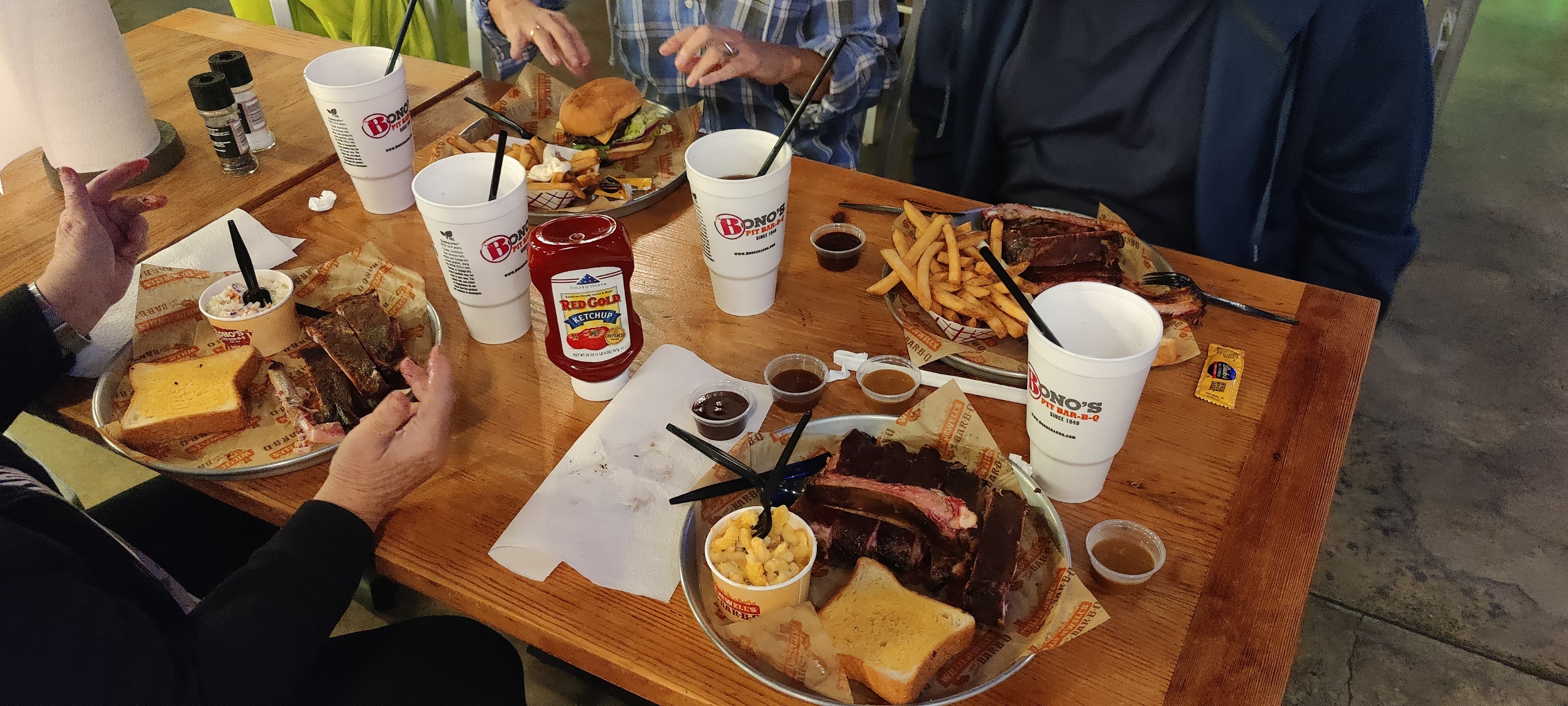 Spareribs😋 sehr lecker. Aber Besteck, Becher. . .  alles Plastik. Nur das metallene Tablet wird wieder verwendet 🙈